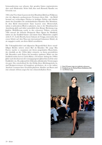 Leinwandversion war schwarz, ihre geraden Linien repräsentierten aber auch Modernität. Sicher half, dass auch Kennedy Kundin von Givenchy war. 1965 schuf Yves Saint Laurent mit dem Mondrian-Kleid aus Wolljersey eine der allgemein anerkanntesten Versionen dieses Stils – das Kleid bestand aus rechteckigen Flächen in kräftigen Farben und ähnelte damit den Gemälden des niederländischen Künstlers Piet Mondrian. In dem Kleid demonstrierte Saint Laurent seine Meisterschaft, indem er jeden Jersey-Block so platzierte, dass er der Mondrianschen Anordnung glich und dabei unmerklich dem Körper Rechnung trug. Jegliche Modellierung wurde in den schwarzen Nähten versteckt. 1966 entwarf die britische Designerin Mary Quant ihr Minikleid, indem sie das Etuikleid kürzte und damit ihren Miniröcken anglich (siehe S. 27). Leslie Hornby, besser bekannt als Twiggy, unternahm den ersten Schritt auf dem Weg zum international bekannten Model, als sie engagiert wurde, um dieses Kleid vorzuführen. Die Unkompliziertheit und allgemeine Bequemlichkeit dieses unauffälligen Kleides sichern seinen Ruf als Klassiker. Die junge Mia Farrow machte es zusammen mit ihrem jungenhaften Haarschnitt, der ebenfalls an die 1920er Jahre erinnerte, zu ihrem persönlichen Stil. Besonders nach Zeiten mit besonders opulenter Mode trat das Etuikleid wieder hervor. Calvin Klein z. B. heimste Anfang der 1990er Jahre nach den Exzessen des vorangegangenen Jahrzehnts Lob für seine Etuikleider ein. Da aufgrund der fehlenden ablenkenden Verzierungen ein guter Sitz entscheidend für den Erfolg dieses Kleidungsstücks ist, sind Designerversionen oft komplexer geschnitten, als es der äußere Anschein vermuten lässt: Geschickt platzierte Abnäher am Busen und eine schmale A-Form sorgen für eine schmeichelhaftere Form.