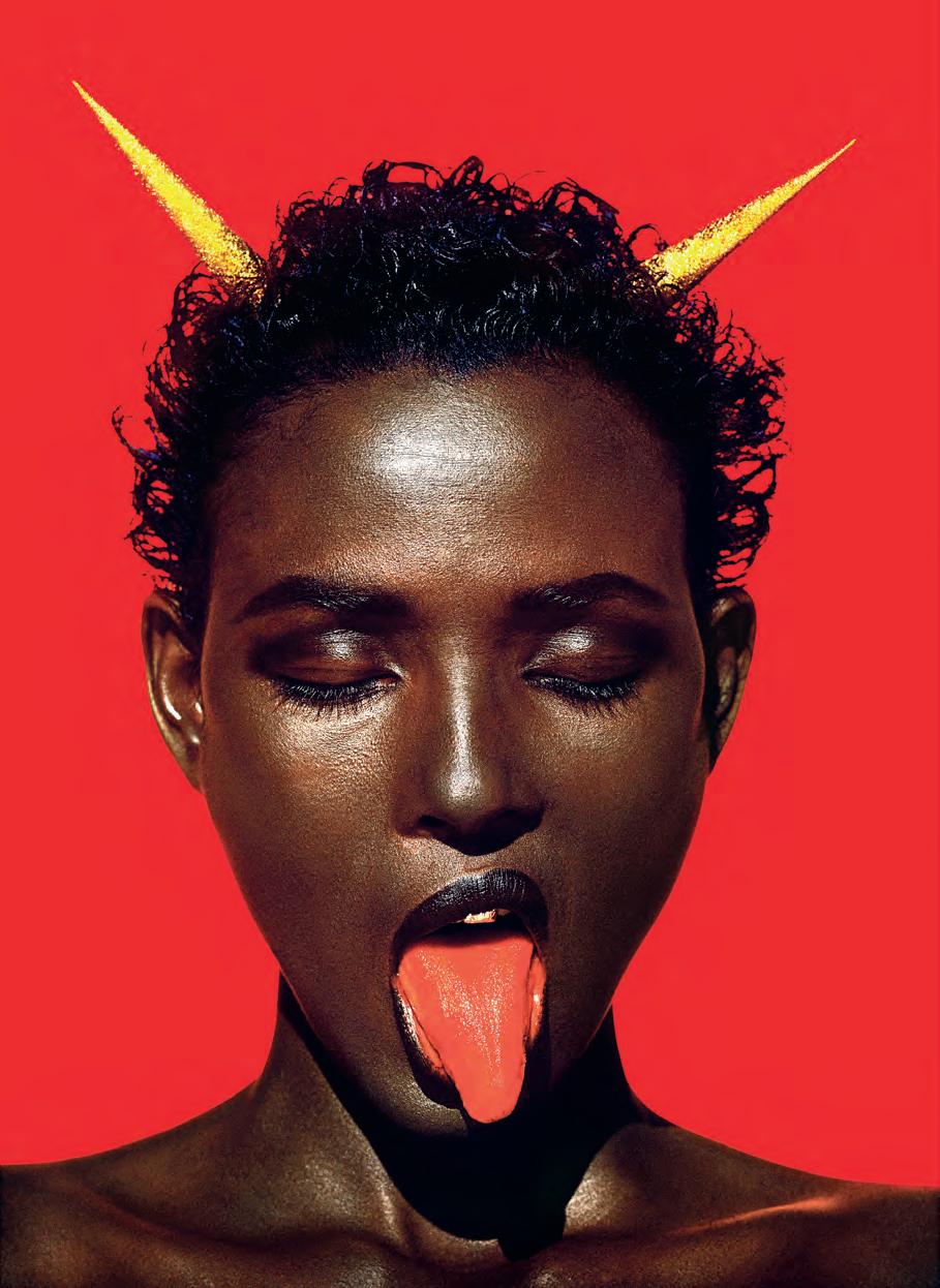 Ein anderes Mal arbeitete ich an einem Projekt für den Stern und landete in Ouarzazate, Marokko, wo ich mit Waris zusammenarbeitete, damals ein bekanntes Model. Ich brachte roten Stoff mit, den ich von hinten mit rot gefilterten Leuchten anstrahlte. Der Stoff war also nicht nur rot, sondern auch das Licht, das darauf fiel. Dabei erhält man einen ganz wunderbaren Neon-Effekt. Ich brachte auch Lebensmittelfarbe mit, um Waris' Zunge rot zu färben, einen Goldzahn, den ich in einem Souve nirladen am Times Square gefunden hatte, und etwas Goldpapier, aus dem ich die Hörner rollte. Wieder war es eine Hasselblad-Aufnahme mit einem 150-mm-Objektiv.