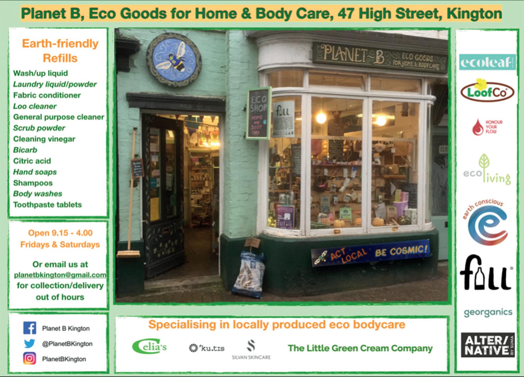dental care, menstrual products, brooms, brushes, scrubbers & scourers and refills. 47 High St., Kington, HR5 3BJ. Open 9.15am to 4pm, Friday & Saturday. E: planetbkington@gmail.com W: www.planetbkington.co.uk