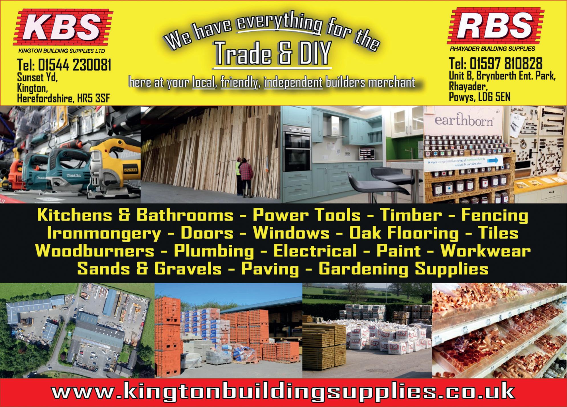 KBS. Kington Building Supplies. Kitchens, bathrooms, plumbing, electrical, paint, power tools, paving, workwear etc. T: 01544 230081 Also Rhayader Building Supplies 01597 810828. Sunset Yard, Kington HR5 3SF. W: www.kingtonbuildingsupplies.co.uk