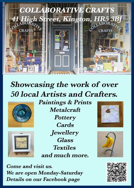 Collaborative Crafts. Showcasing a wide range of art & craft to suit every pocket. 41 High Street, Kington HR5 3BJ. Offering shelf space to local artists and makers. Anna King 07977 978676 or E: anna@akcrafts.co.uk