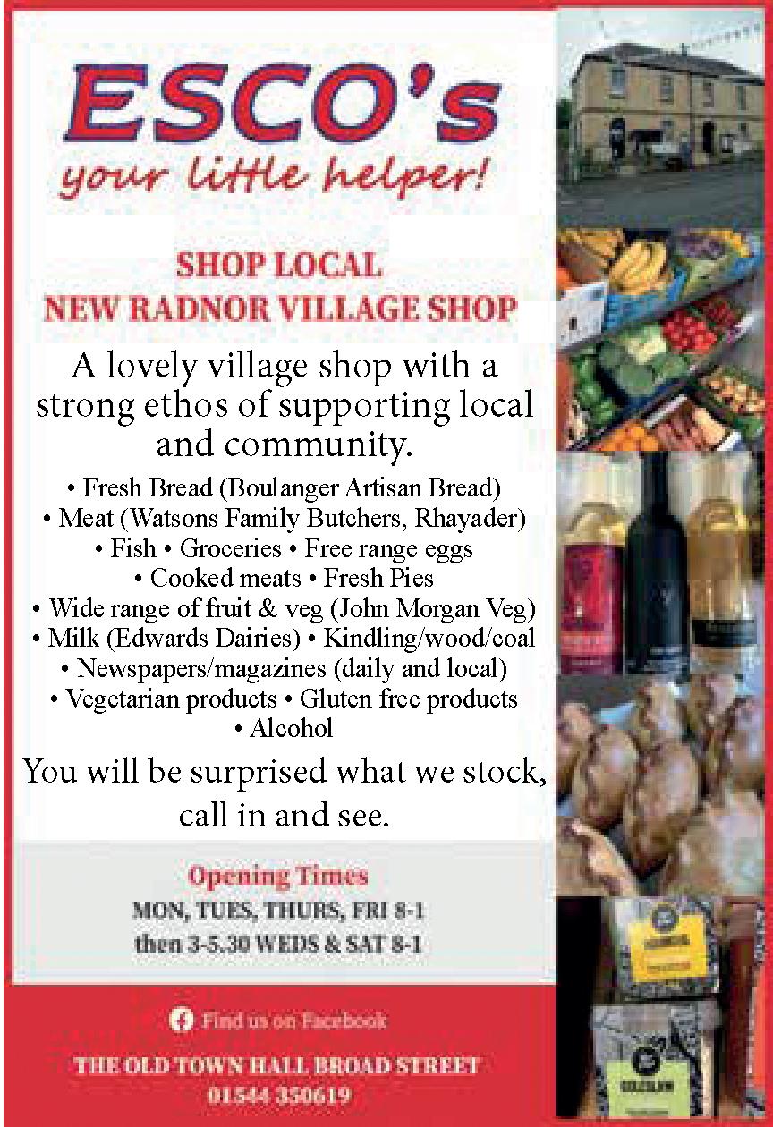 Esco. We are a small independent village shop that has been going for 10 years. We have fresh stock daily including fresh vegetables, fruit, milk and bread. We have fresh meat, cooked meats, pies, fish and cheeses weekly. As well as groceries, wood and coal. We try our best to get what is requested. Open Mon, Tues, Thurs, Fri 8 to 1 then 3 to 5.30 Weds; Sat 8 to 1. We are passionate about supporting local suppliers and maintaining a community. The Old Town Hall, Broad Street, New Radnor. T: 01544 350619