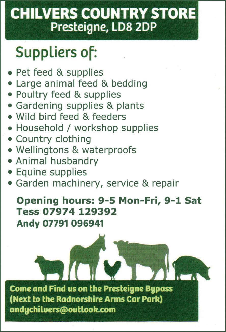 Chilvers Country Store. For all your livestock, equine, pet, gardening and country life needs, including clothing and machinery. Find us on the Presteigne bypass next to the Radnorshire Arms car park. T: Andy 07791 096941