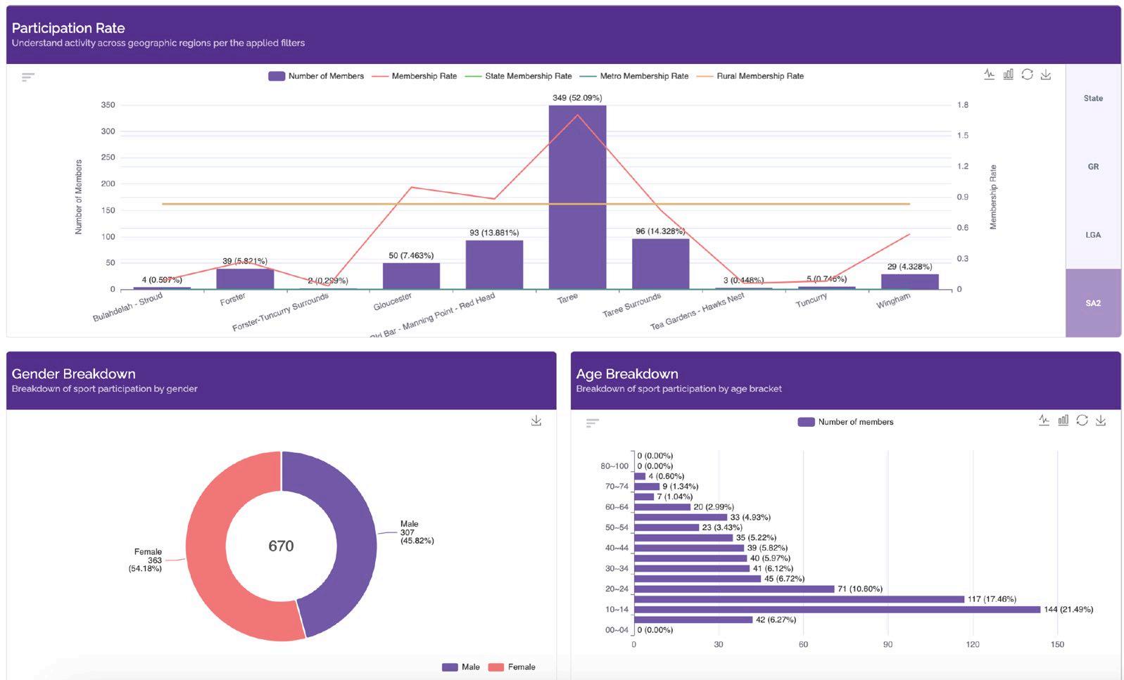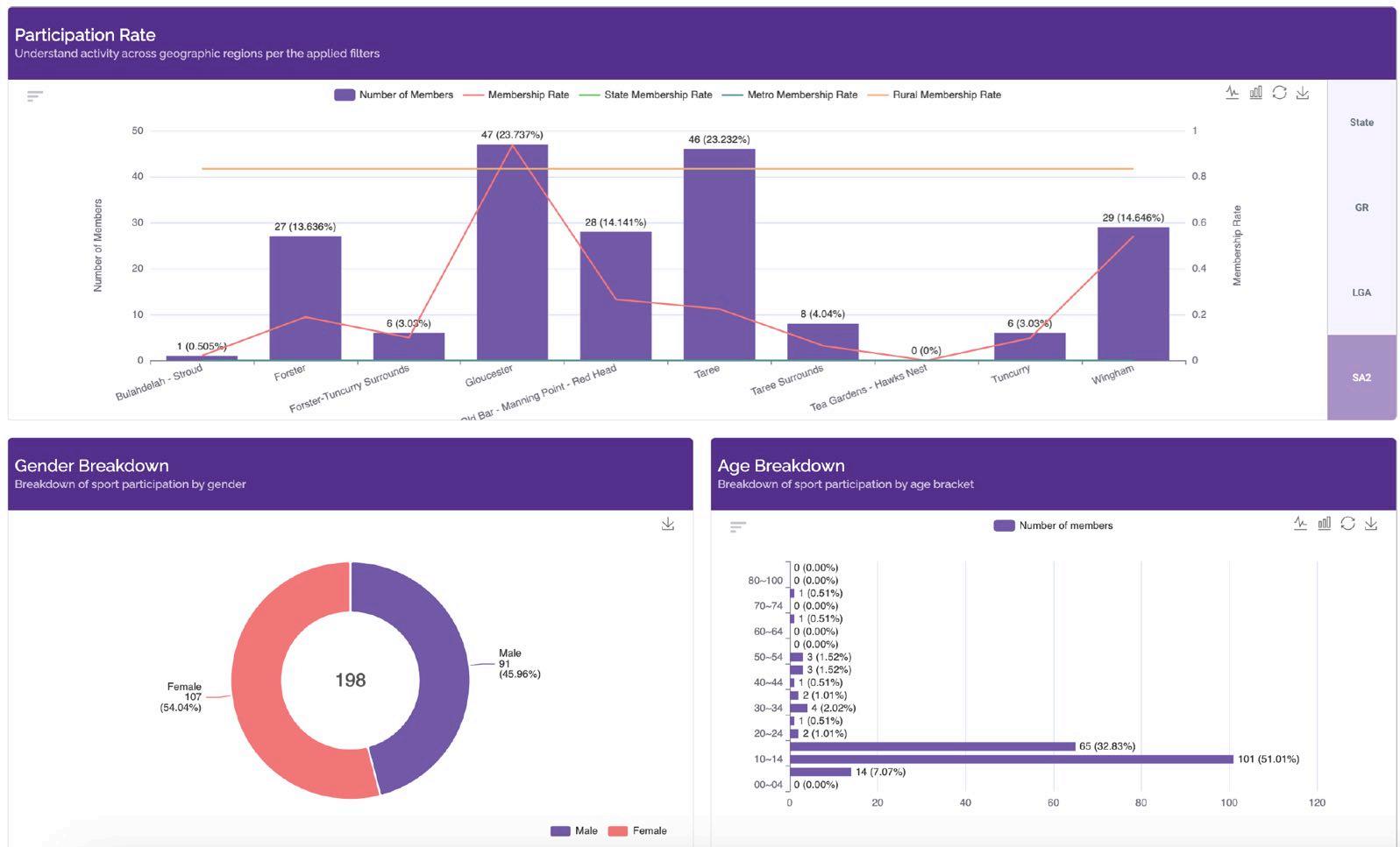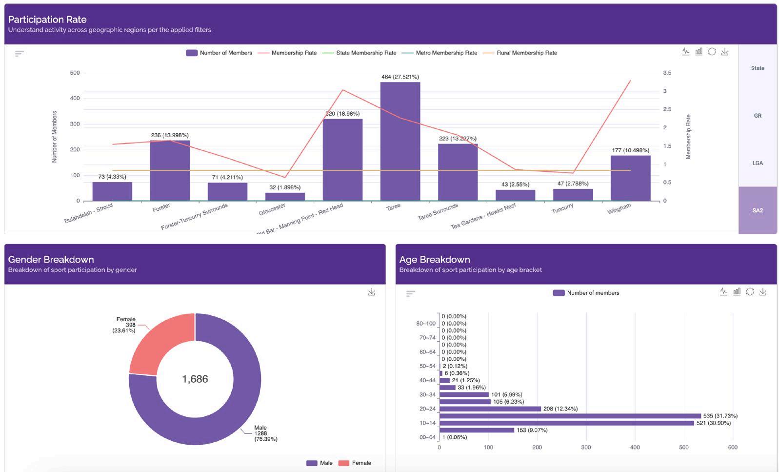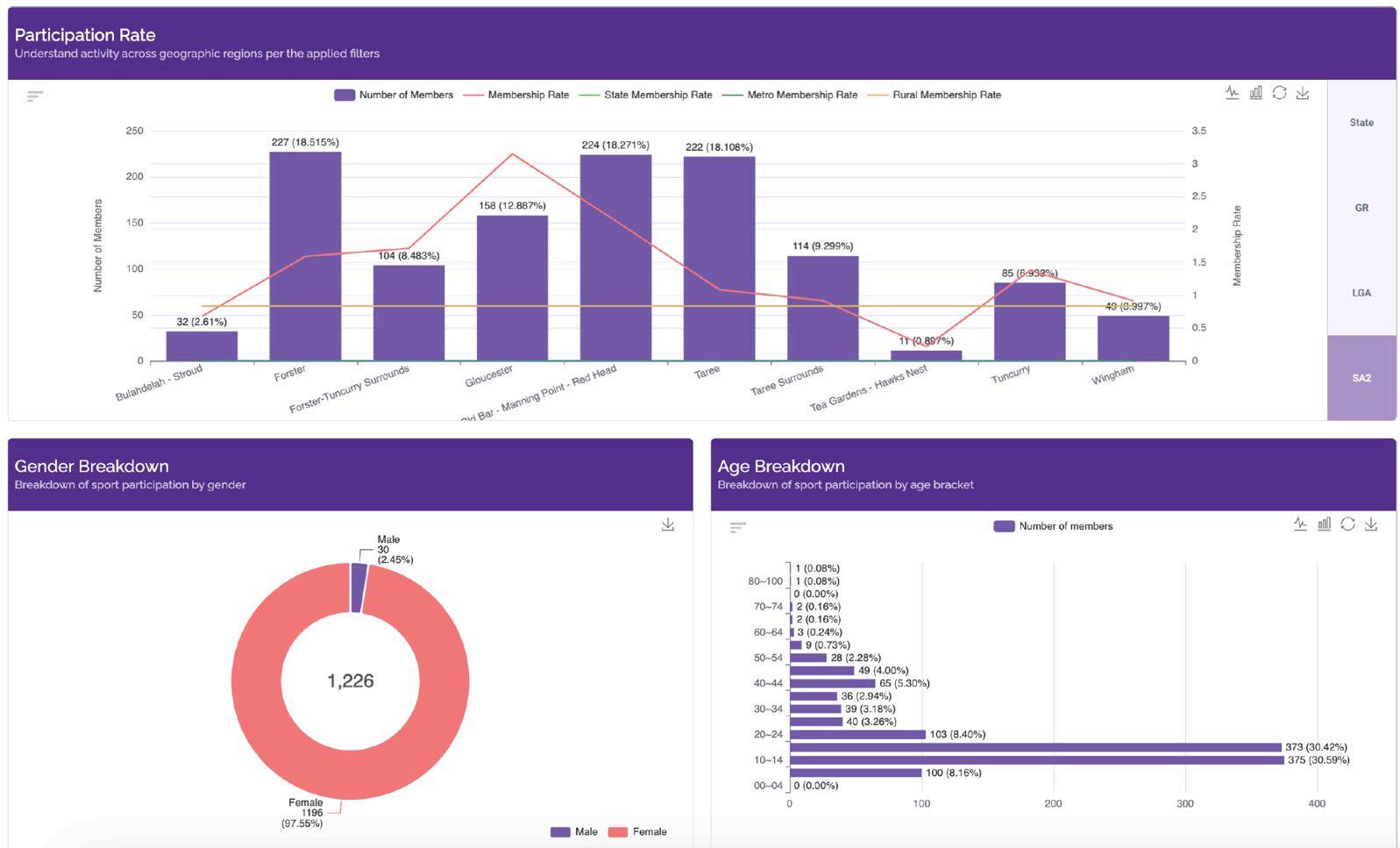 The following summaries are sourced from relevant State Sporting Organisations for the MidCoast LGA by suburb (statistical area level 2), gender and age. These only show members living in the LGA which may differ to club/association numbers.