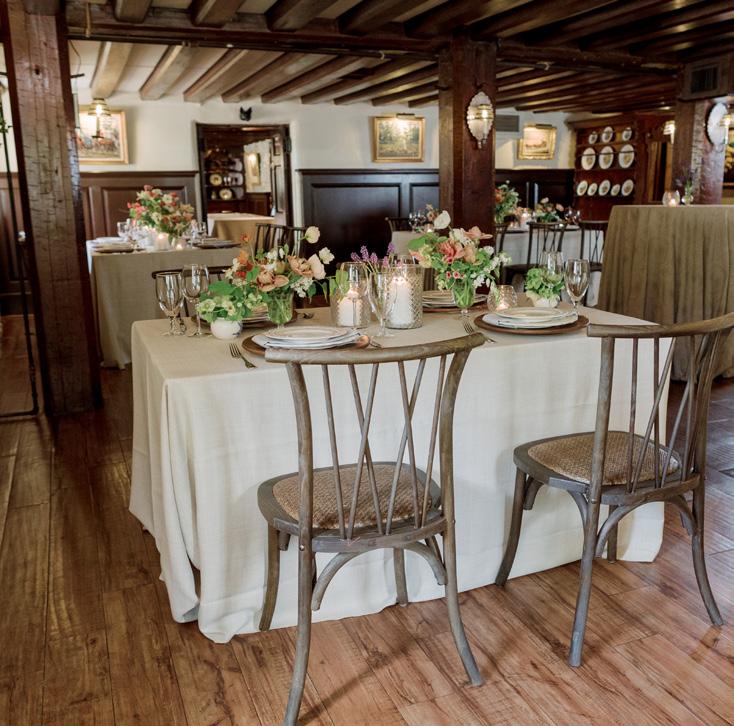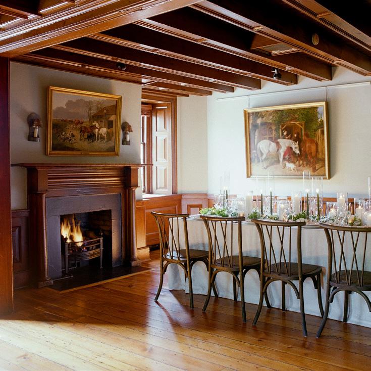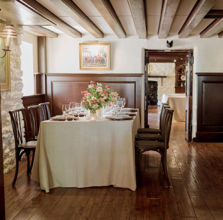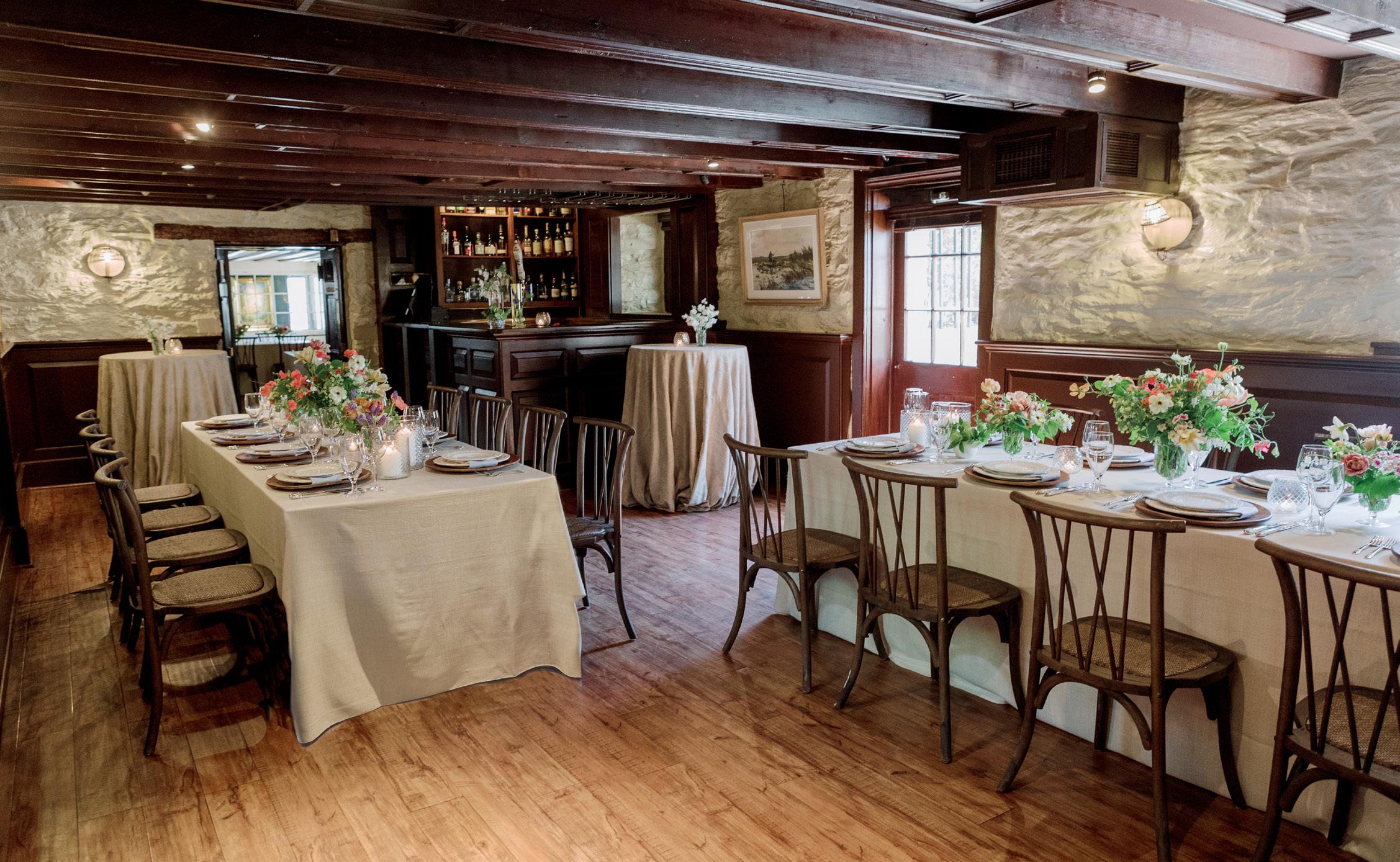 These warm and inviting rooms boast exposed stone walls and original beamed ceilings, creating an event space filled with time-honored tradition and a welcoming atmosphere. Embellished with Hunt Country-inspired paintings and sculpture, this iconic Red Fox Inn & Tavern scene is filled with reminiscent living room charm.