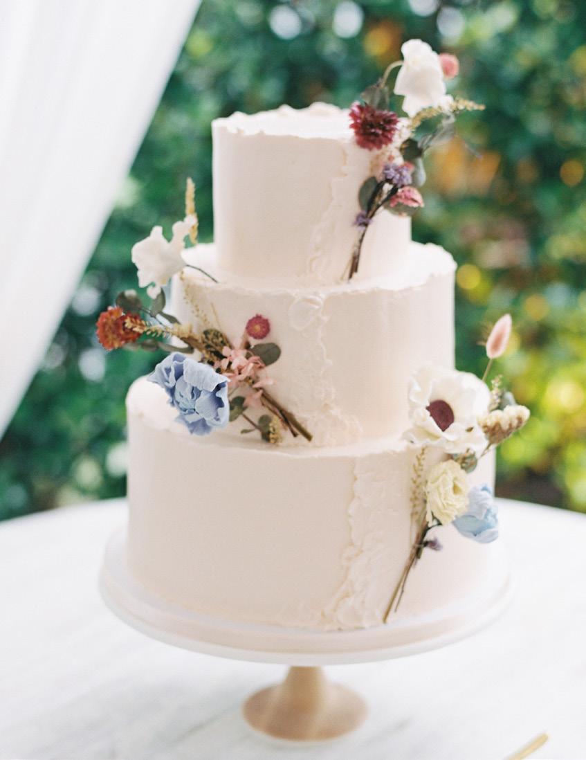 Tailor-made tiered wedding cake designed by the couple paired with a Prosecco toast
