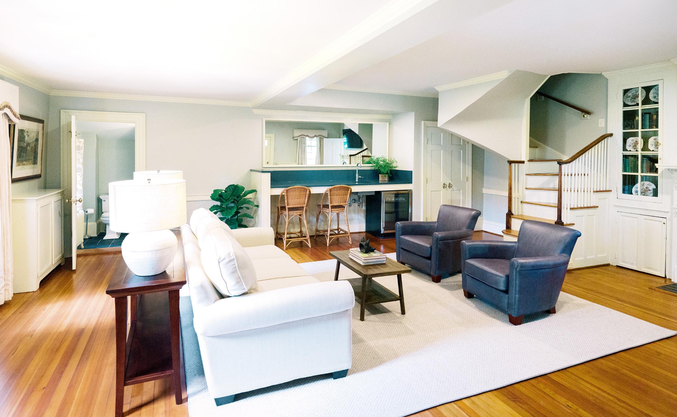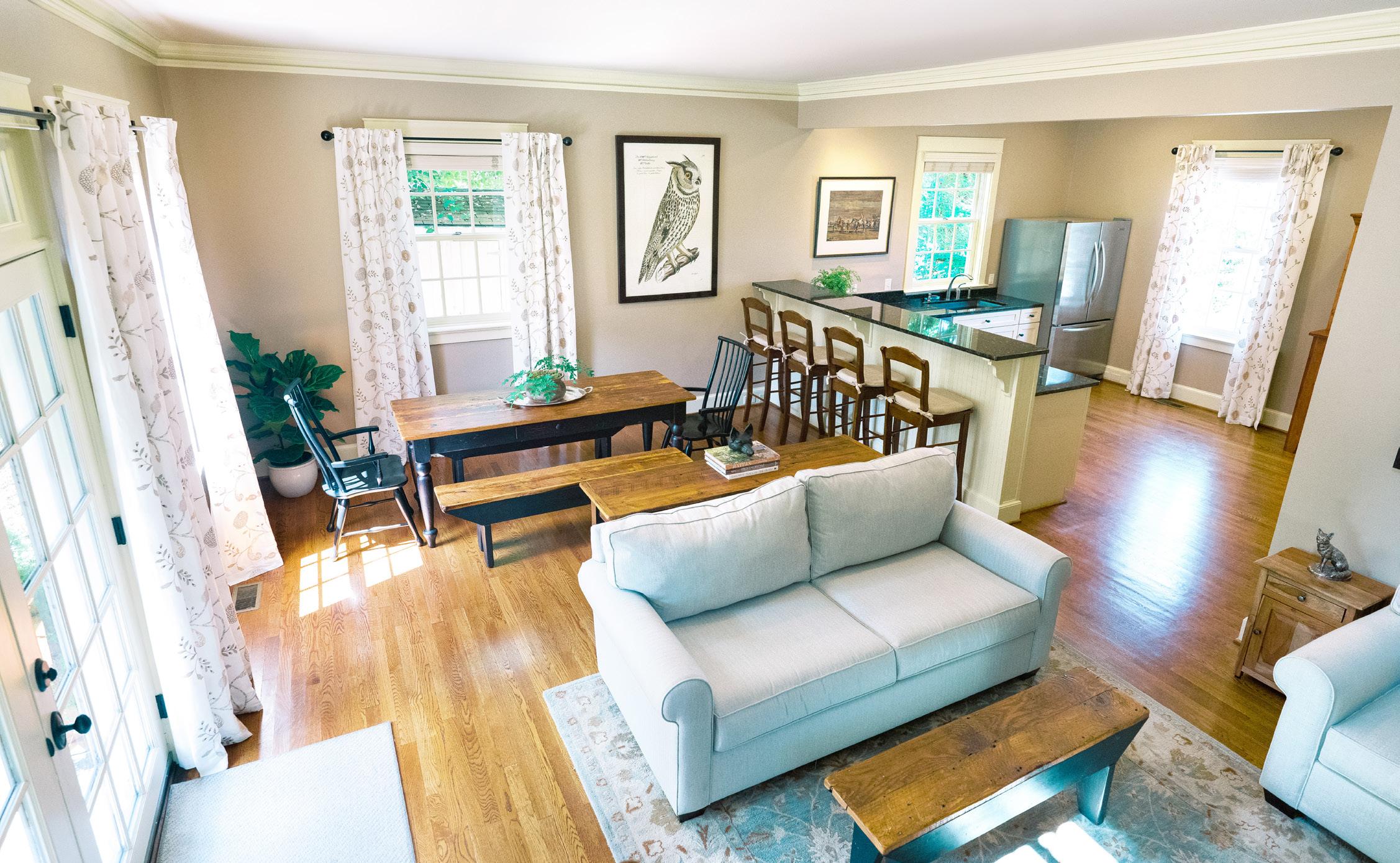 A secluded two level cottage enclosed by a private courtyard garden, featuring a full kitchen, open dining and living room, king and twin bedrooms, full bathroom and powder room.