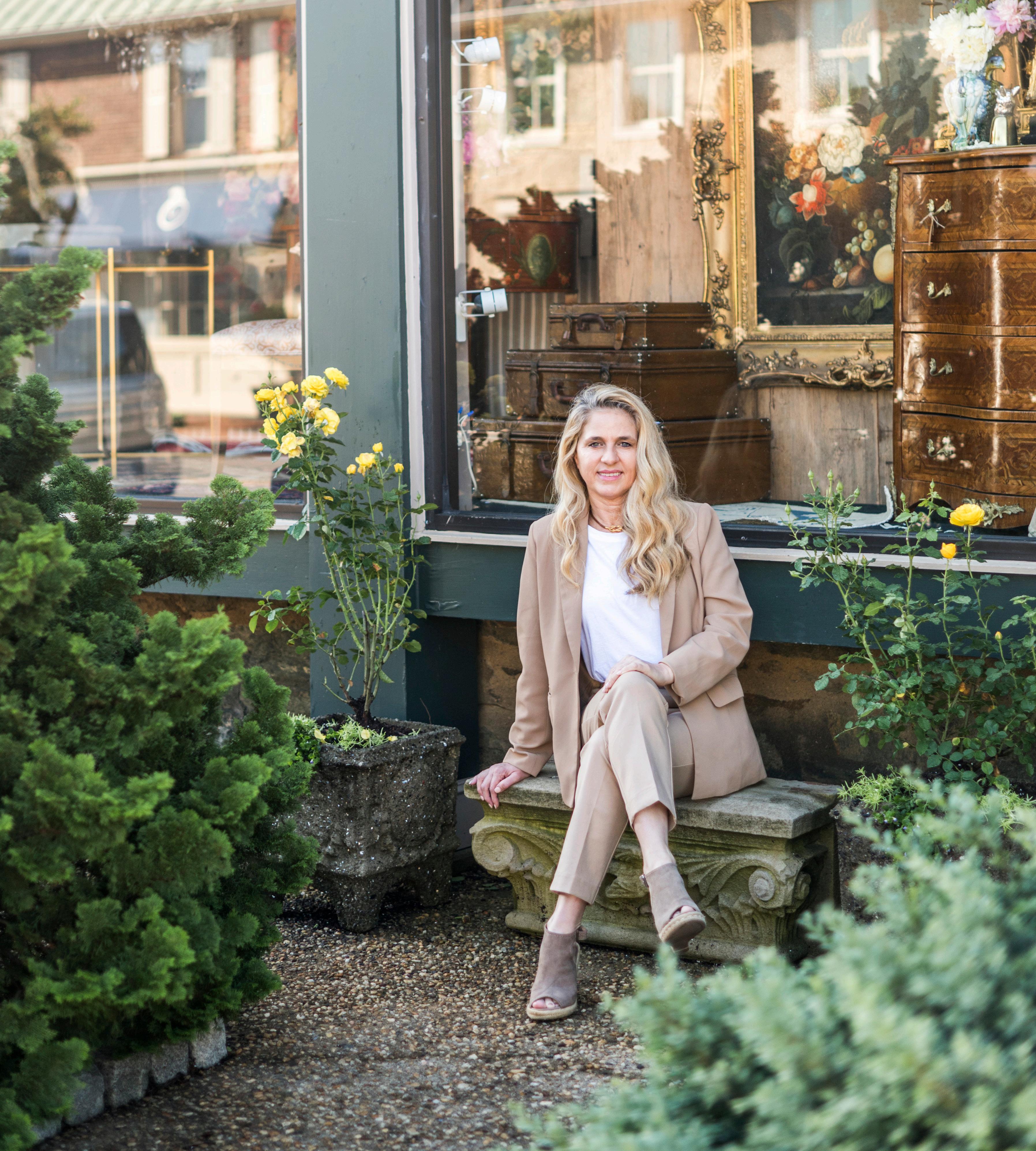 Sitting on a stunning silver antique velvet couch with Khaleesi, the shop dog, nestled beside her, Mason shares, “My parents were always into antiques. That is how I started, going to auctions when I was little.”