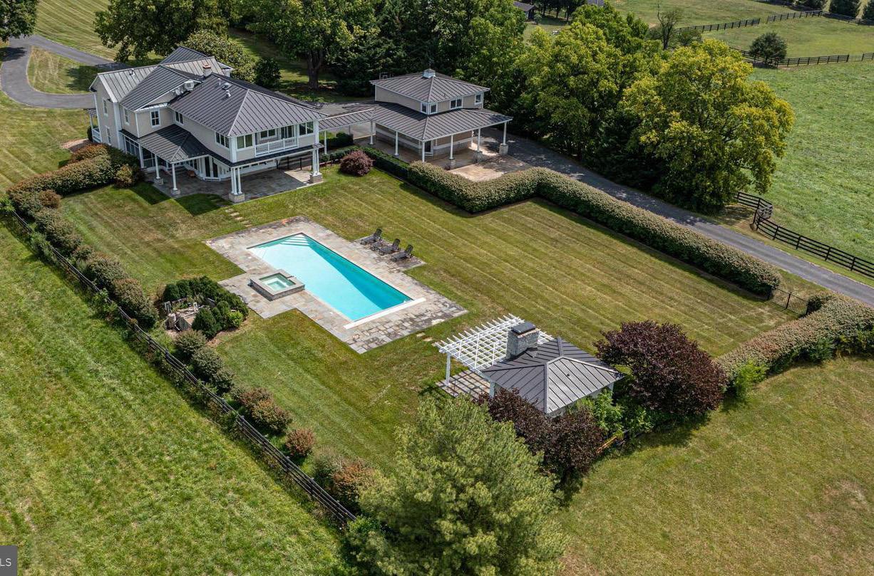 Well protected Fauquier location | 6 bedrooms | 4 full and 2 half baths | 3 fireplaces | Great views | Pool with large flagstone terrace | Large county kitchen | 4-car detached garage with apartment/ office | 9-stall barn | Covered arena | Outdoor ring | 4 stall shed row barn | 51 fenced acres