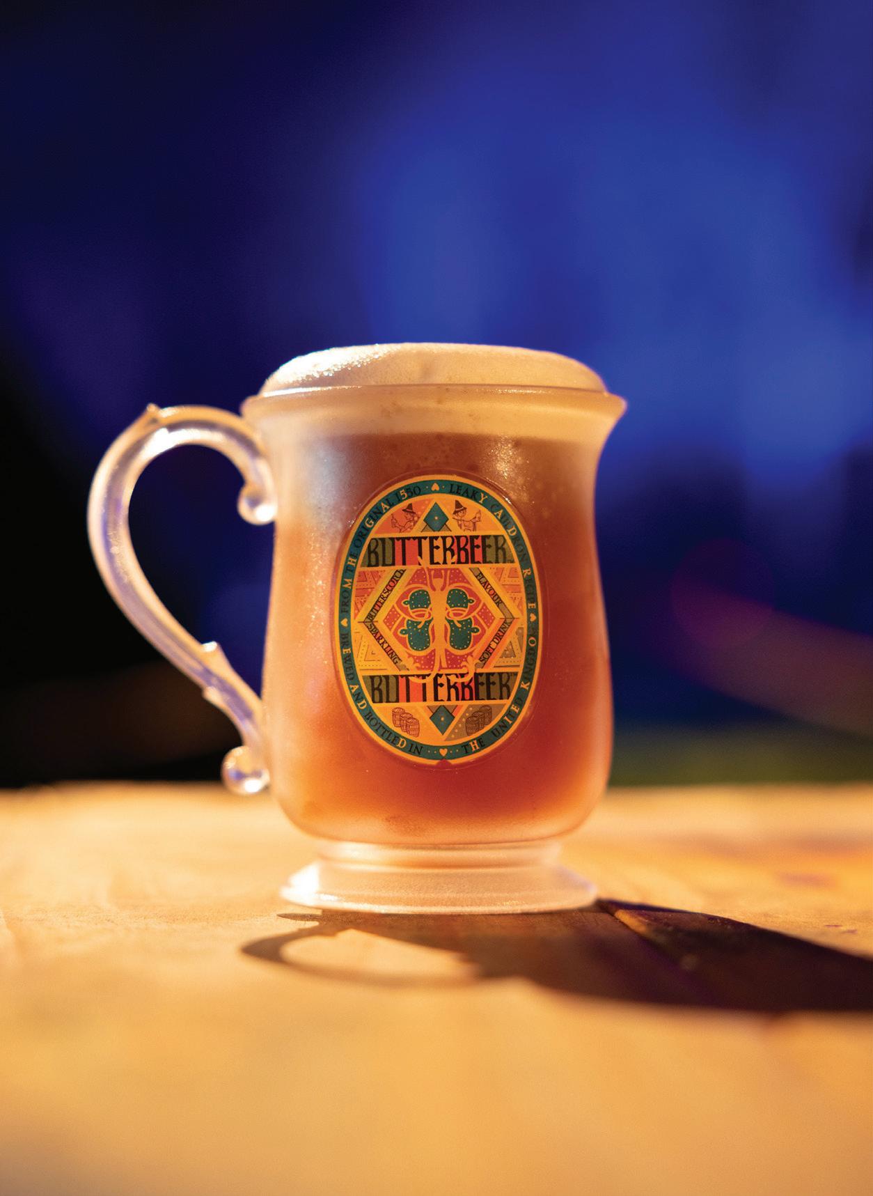 Top: Reggie, one of the park’s magical staff, serves up Butterbeer. Bottom: Visitors can take a piece of the experience home with them from the gift shop.