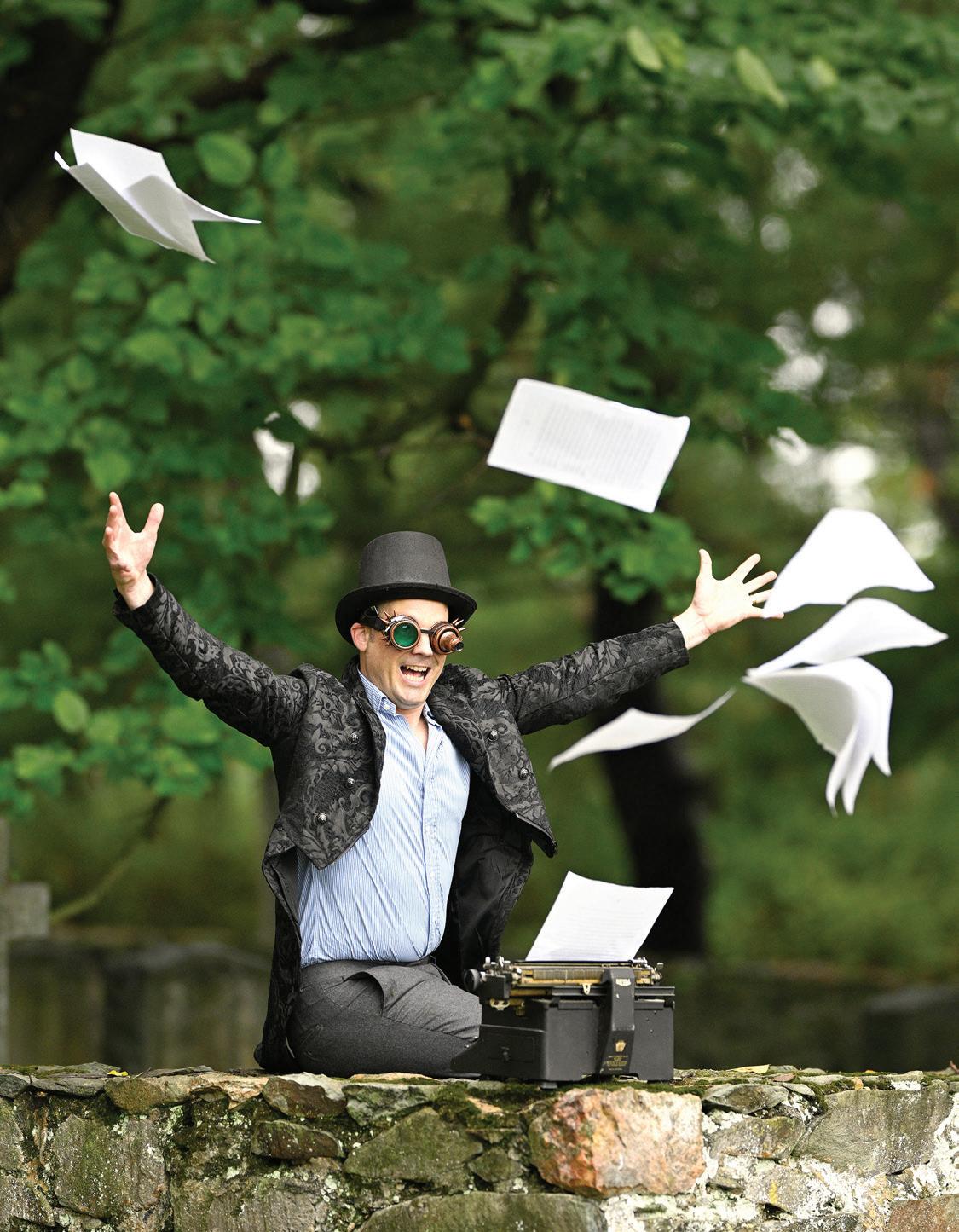Left: Potter brings a bit of magic to his writing. Photo by Shannon Ayres. Middle: Potter’s second book. Artwork by Honie Beam. Right: Porter with his guitar. Photo by Shannon Ayres.