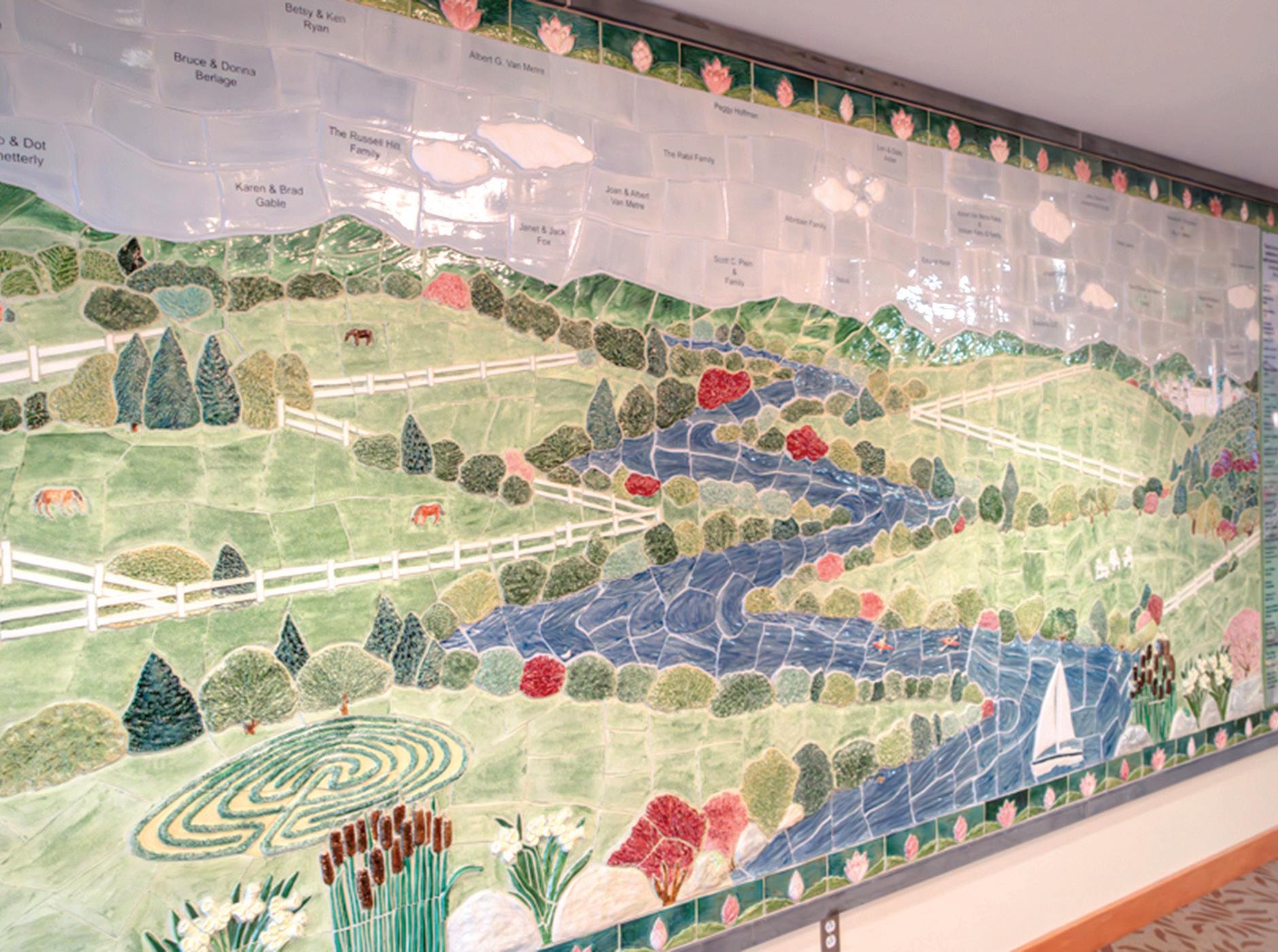 Top: Franklin Guerrero, VP of philanthropy, and Steve Cone, chief of communications, marketing, and philanthropy. Middle: A tiled mosaic adds a pop of color to the Adler Center. Bottom: The common space is warm and cozy.