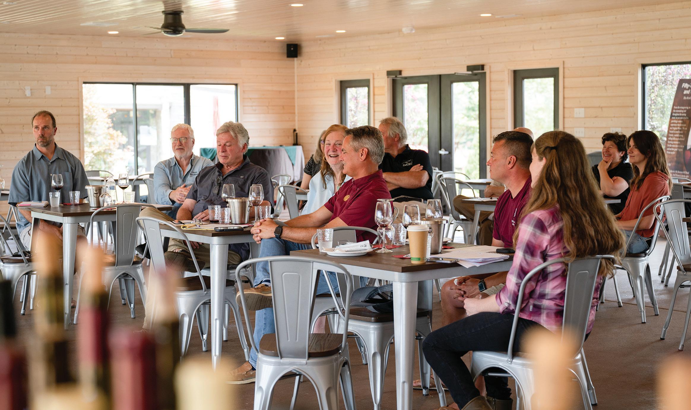 Rolling hills of vines unfold before guests as they walk up the hill to the tasting room, with seating inside, on the patio, or under a canopy of trees where dappled sunlight peeks through. Nature is skillfully woven into the entire experience, from the bar’s tabletop of river stones under glass to tables with leaf impressions pressed into the concrete surface.
