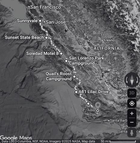 Aftermuchdiscussion,wedecidedtofindanalternateroute,and headedbackthroughthestinkingoilfield Butafterthirty-fivemiles ofbikingthatday,theafternoonheatandtherapidlyapproaching sunset forced us to stop and call our support driver (my dad) for help Defeated,wehitchedaridetohishotelinPasoRobles,where weateChipotle,satinthehottub,andplayedBrawlStars Trulya devastatingdefeat,andtwentymilestragicallymissed Onthefifthday,wehadplannedtostayatourfriendShae‘26’s house in Baywood-Los Osos, forty miles from Paso Robles We textedherthemorningoftoremindherthatwewerecoming,and thenathoughtoccurred:itwasonlytwodaysleft Surely,shedidn’t haveanythingimportantlefttodofortherestofthesummer?“I rememberIwasjustmindingmyownbusinesswatchingTVwhen Mateo texted saying that he would be there in a few hours,” she recalled “Iinitiallythoughttheywerejoking Butmyparentslooked at me dead serious, and said ‘ you should go. ’” After crossing the Santa Lucia mountains and escaping the beating heat of inner California,wecoastedalongthecoasttoherhouseandpickedup thethirdmusketeerofourtrip.