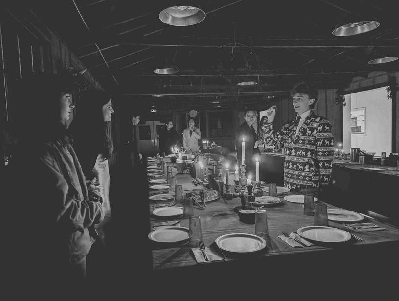 Aftertheconclusionoftheoutdoorportionoftheevent,weallextinguishourcandlesandprepareourbelliesforthe mouthwateringfeastthatlayahead.WhenweenterStillman,it'smagical.Mistletoehangsfromtheraftersoverthetables arrangedinfourlongrowsdecoratedwithredtablecloth,candles,andfestivefloralarrangements.ThesetupofStillman leavesuswithlessseatingspacethanweareaccustomedto,butwemanage,crowdedtogetherbaskingindimcandlelight andlaughter.Aftersayinggraceandcommemoratingthekitchenstaff-Gloria,JoséandLupitaalongwithnumerous volunteers-forthetamales,wedigin Withhotappleciderandempanadasaswell,itisadeliciousfeast Whendinneris over,weareallsadtoleavethewarmthandheadbacktoourcabins,butwedo,thoughsomeofuswhodidn’tcome preparedwithahandyCarhartorPatagoniaJacketaresubjecttotheharshwinterchills.Perhapsnextyeartheywillhave moreforesight,thoughprobablynot.
