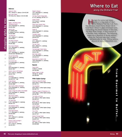 ungry for some real Italian pasta or a big plate of ribs? The Midland Trail has it all, from fine dining to down-home diners full of local flavor. Dine in a glass-enclosed room overlooking the Grand Canyon of the East, the New River Gorge, or find comfort at a familiar chain restaurant. The following pages are a directory of dining options along the Trail and side trips, sorted alphabetically by area. Dining options abound at www.midlandtrail.com.