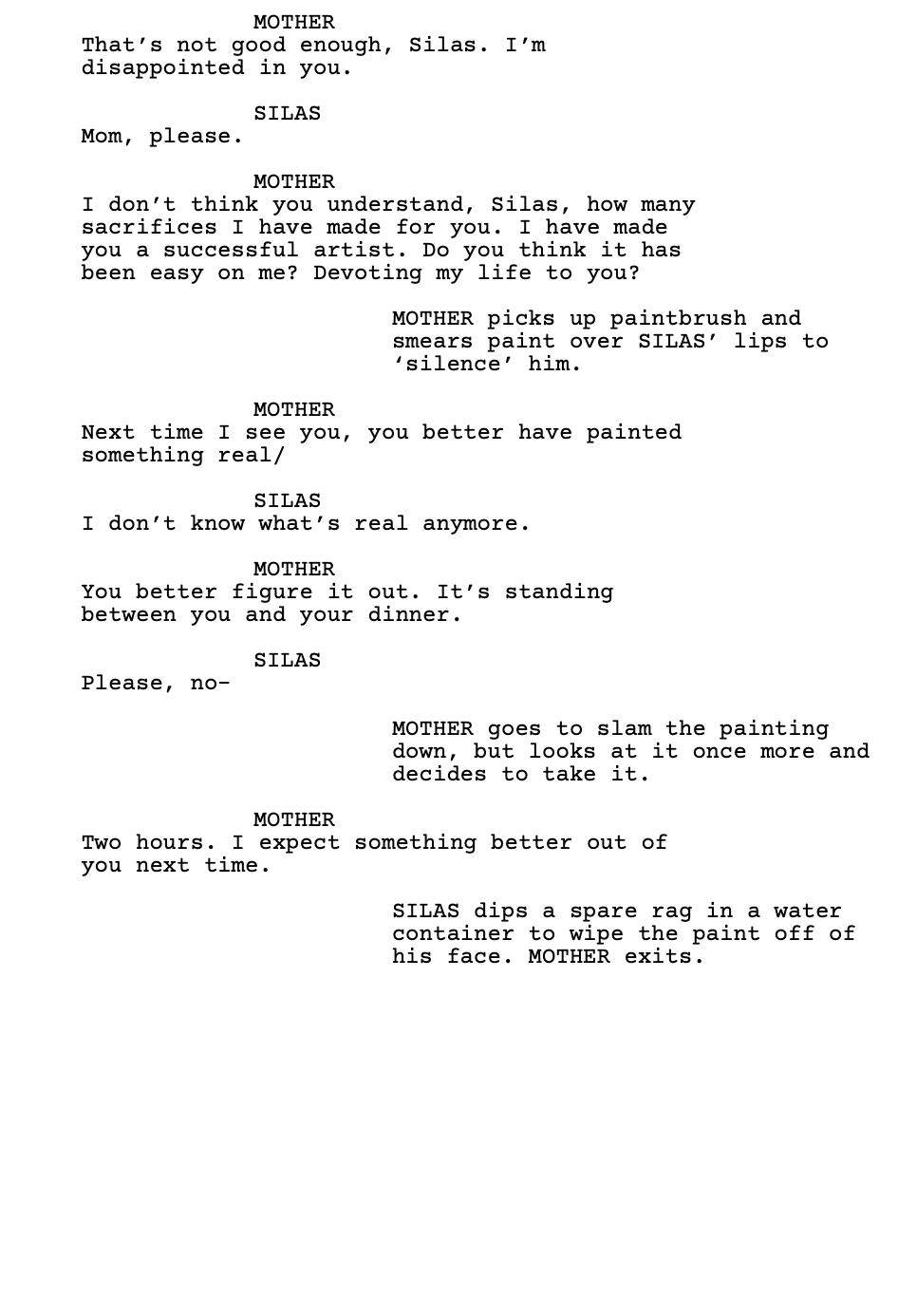 Igrabbed the logs and got on the skiff. Nine logs was enough for the day, plenty for the day, enough work for me. Gotta make my way to town, sell these logs off. I made it into town, selled off the logs and took my seat on the bench outside. Education? Reading? Thinks he’s BETTER than me, they all do. Never enough, NEVER enough, I don’t read why should he? Thatcher Thatcher Thatcher honest man a THIEF. It belongs to me that boy belongs to me does being his father mean nothing? The trees reaked, always hated this smell, ONE step, ONE step, can shut them after the door. Not right not right where’s the boy. I tossed the cabin, trying to find this good for nothing boy of mine. HERE you are HERE you are HERE you are why would he hide from me. Belts on the table, I’ll be ready.