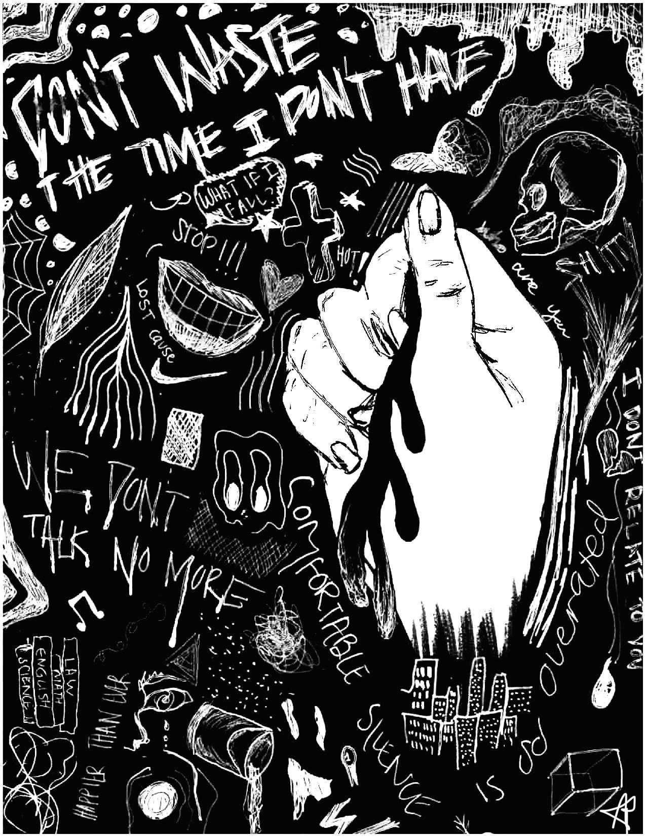 Before I realize what she is about to do, she leaves, and runs around the front of the bus that has now created a blind spot. She runs out into the traffic. The city, once loud, falls to an eerie silence as the loud crash fills the space. The bus driver runs out, people follow, shoving past me. I can’t bring myself to go around the bus, look at the chaos that just occurred. At a loss for words, I make my way onto the bus. I force myself to the back seat. I sit down, facing away from the street side windows. Covering my mouth, the tears start erupting from my eyes. The city was loud when I was thinking about killing myself. It is silent now.