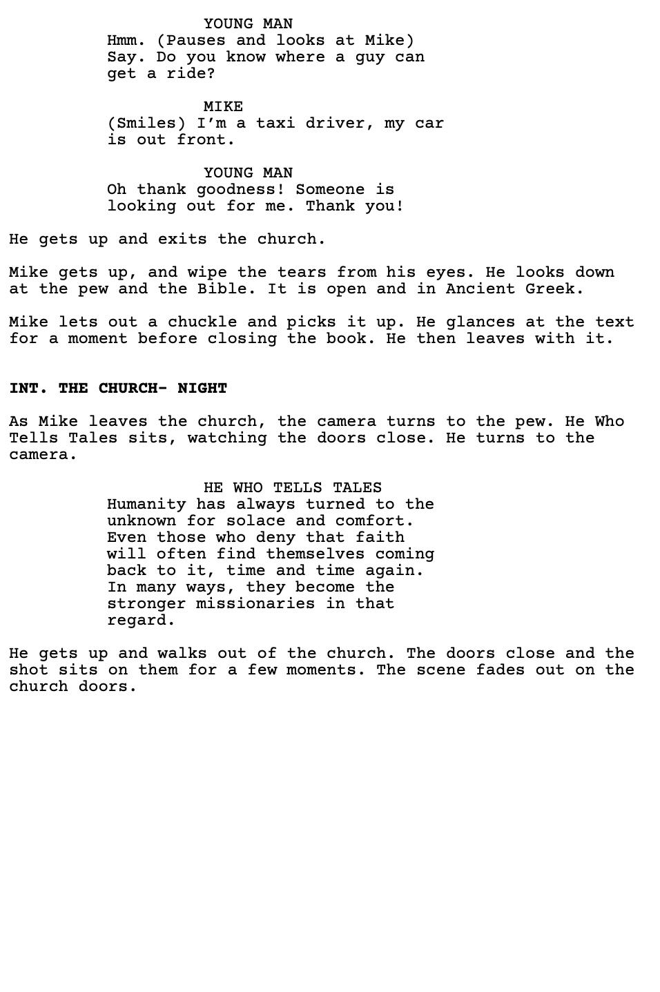 So why haven’t I killed myself? That’s a good question. I am old, forcibly retired, my kids have their own lives, and my wife is gone-the nerve she had. What’s left for me here? The reality is that it’s hard to do. I mean, when people constantly come to pester you with problems, it gets pushed to the side. Neighbors wanting a babysitter, volunteer work at church, dealing with your grown-up kids. All these complicate matters. I mean, who’s to say I just can’t ignore them all? Just get on with it. Well, if I left this world on my own accord, blow ing off obligations my wife would beat me for eternity. I’d bet my life on that.