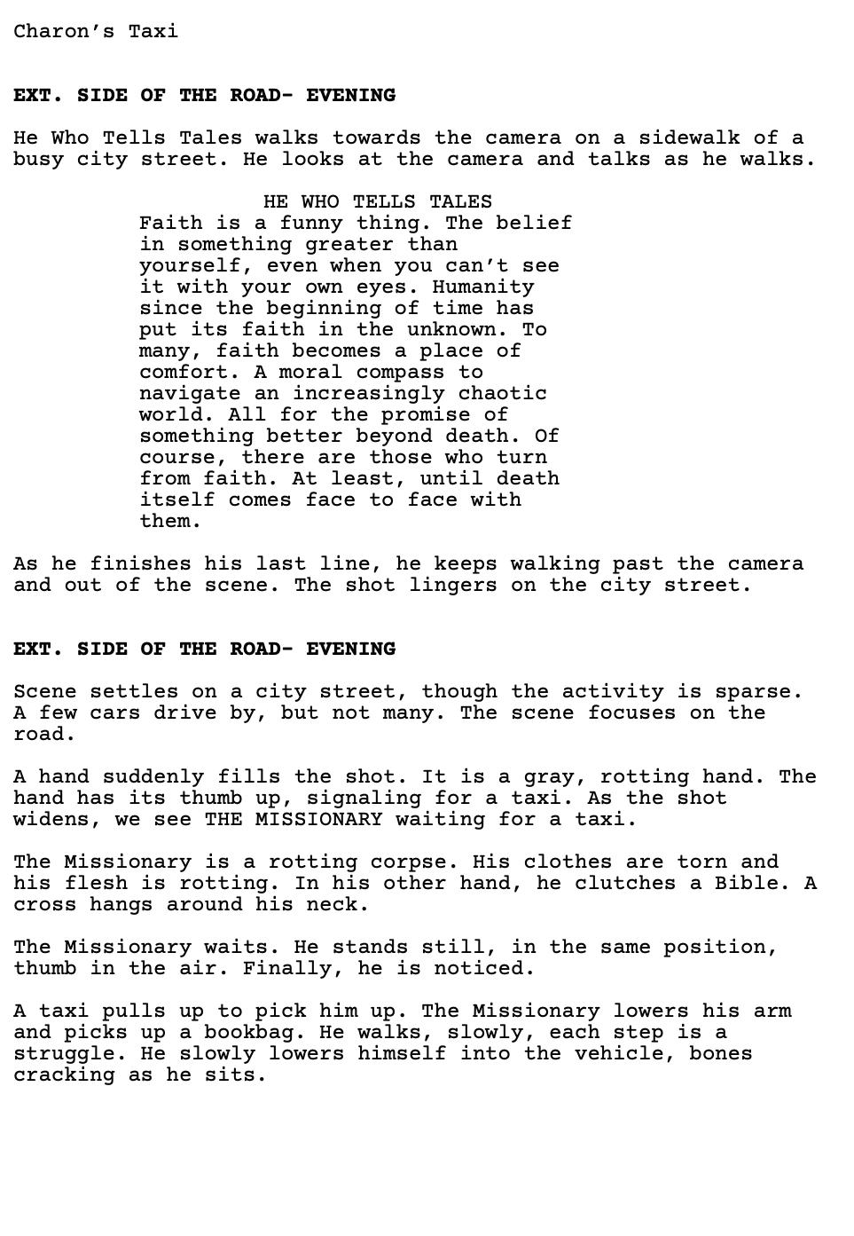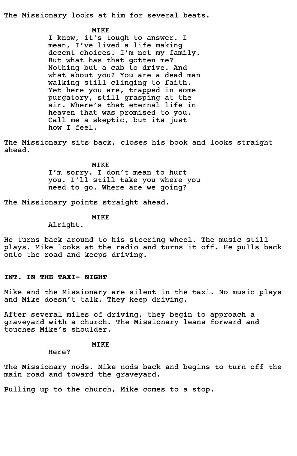 The thought crosses my mind, I won’t lie to you. I crane my neck to look down the street. The bus is nowhere to be seen. I look down at my leather shoes, worn from years of use. My wife had gotten them from me. I look back at the street, a tear running down my eye, and I seriously consider taking that walk. After a mo ment, I slowly make my way to the bench and sit down. The metal is cold, but I don’t notice. I’m certainly not scared to do it. I just want to give the bus a few more minutes.