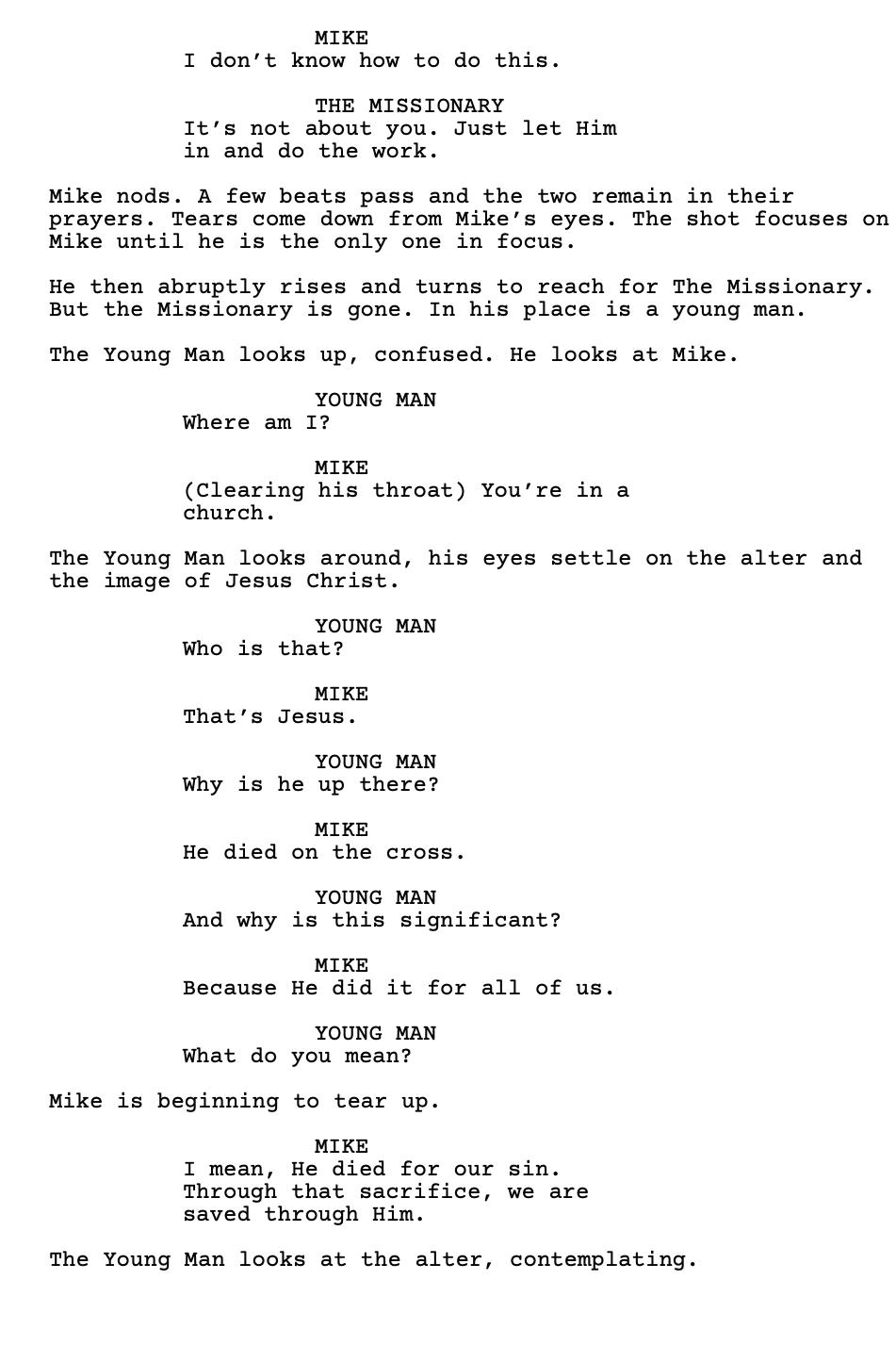 I look at her confused. She looks at me, grabs my shoulder and looks down at me. A tear begins to slide down her face. “I am not scared anymore. And neither should you.”