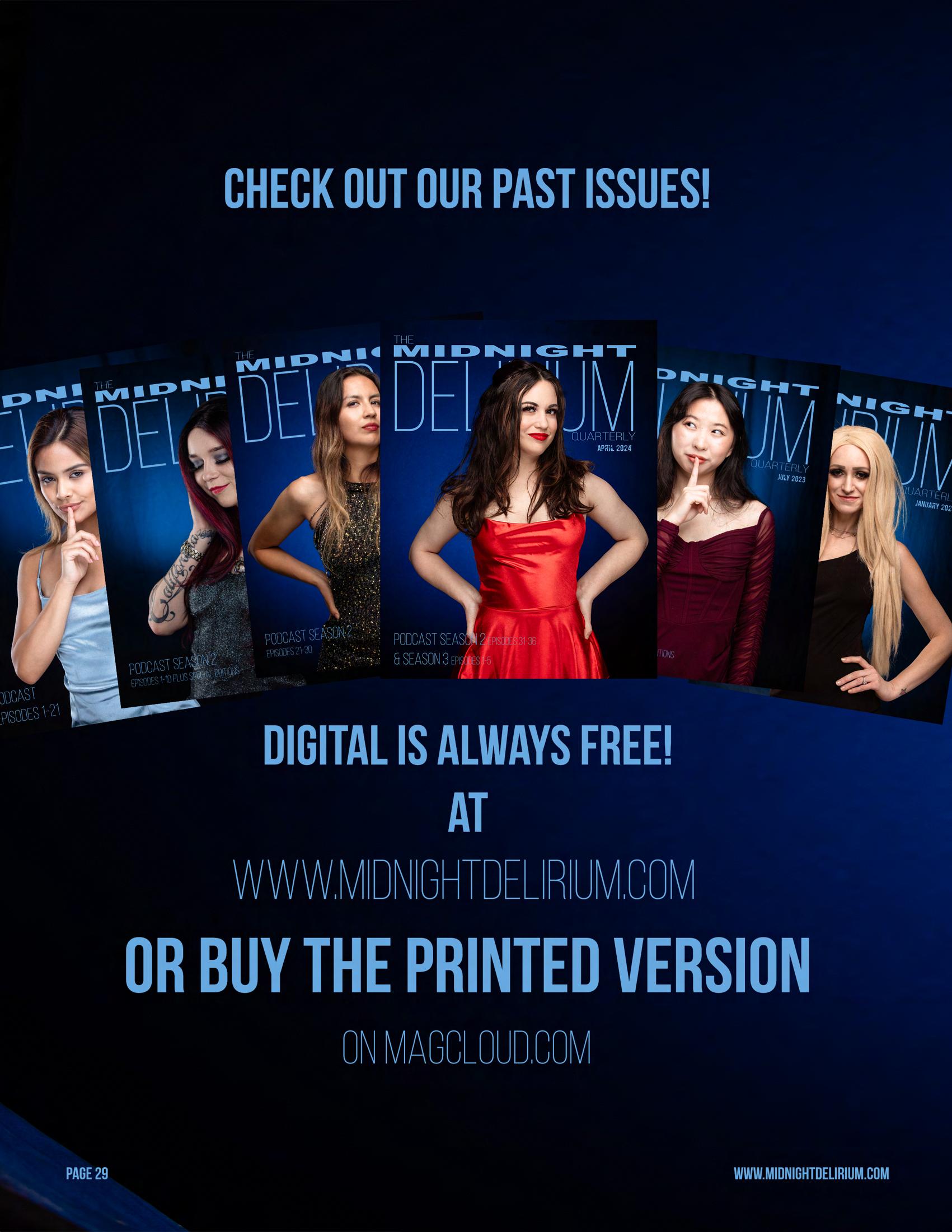 The sixth quarterly magazine from Midnight Delirium! This issue covers the October 2023 to March 2024 podcast episodes. Plus additional articles on relationships and other topics. Plus the top music, booze and the shout outs from the covered podcast episodes.