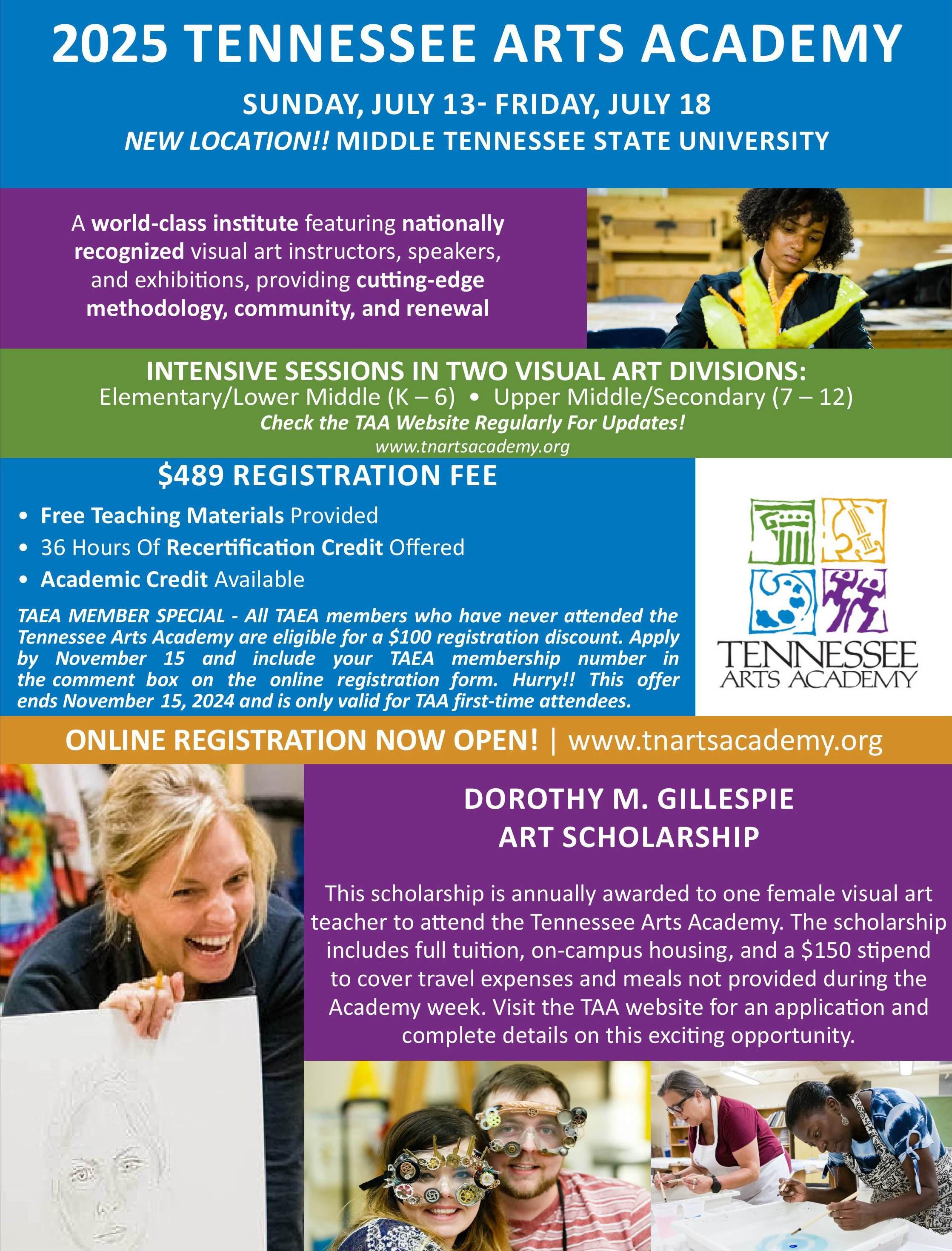 done an incredible job promoting the conference and creating the registration process on our website. Thank you to all our guests, including presenters, teaching artists, sponsors, vendors, and others who are here to share exciting ideas and resourceswithTennesseearteducators.