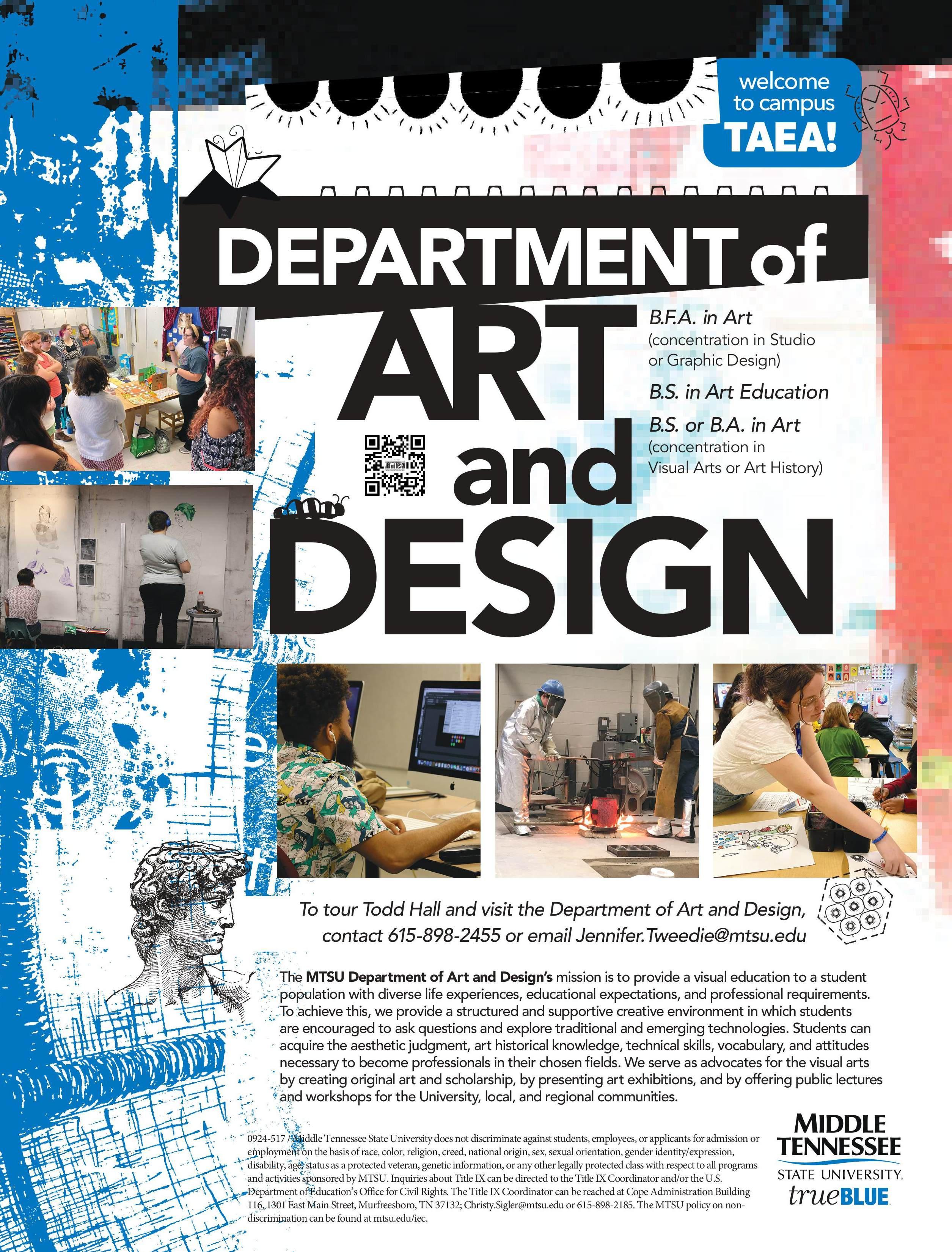 ItiswithgreatpleasureandadmirationthatIextend a warm welcome to each and every one of you to Middle Tennessee State University in Murfreesboro. As we convene the dynamic community of art educators in our state, I want to take a moment to acknowledge the remarkable work you do. Your dedication to fostering creativity and nurturing artisticgrowthisprofoundlyimportant.