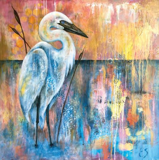 In Flight Over the Magnolias, Stesch imagines the habitat of the two geese flying overhead. In Quiet Waters, Stesch focuses on the great blue heron in a more realistic approach to her subject matter. In her acrylic-on-canvas pieces, Stesch envisions safe and protected habitats for the subjects of her paintings.