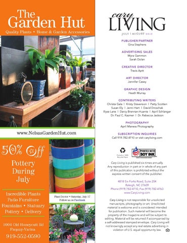 J u ly | Aug u st 2 0 10 publisher/partner Gina Stephens advertising sales Myra Gammon Sarah Dolan creative director Travis Aptt art director Jennifer Casey graphic design Heath Murray contributing writers Christa Gala | Kristy Stevenson | Patty Scotten Susan Ely | Jenni Hart | David Droschak Illyse Lane | Darcy Brennan-Huante | April Schlanger Dr. Paul C. Kazmer | Dr. Rebecca Jackson photography April Maness Photography subscription inquiries Call 919.782.4710 or visit caryliving.com