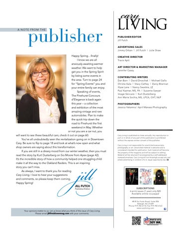 Happy Spring…finally! I know we are all anxiously awaiting warmer weather. We want to help get you in the Spring Spirit by listing some events in the area. Turn to page 24 for “Spring Events” you and your entire family can enjoy. Speaking of events, The Pinehurst Concours d’Elegance is back again this year – a collection and exhibition of the most amazing vintage and rare automobiles. Plan to make the quick trip down the road to Pinehurst the first weekend in May. Whether or not you are a car nut, you will want to see these beautiful cars; check it out on page 60. You’ve all undoubtedly seen the revitalization going on in Downtown Cary. Be sure to flip to page 18 and look at what’s now open and what shop owners are saying about this transformation. If you are still in a dreary mood from our winter weather, then you must read the story by Kurt Dusterberg on Sio Moore from Apex (page 42). It’s the incredible story of how a community helped one struggling child make it all the way to the Oakland Raiders. This is an inspiring story you can’t miss. As always, I want to thank you for reading Cary Living. I love to hear your suggestions and comments, so please keep them coming. Happy Spring! JILL FUTCH