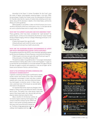 According to the Susan G. Komen Foundation for the Cure®, since the onset of regular mammography screening began in the early 1990s, the percentage of deaths from breast cancer has decreased by 30 percent. Dr. Chandler notes that the majority of medical data validating current standards, along with the decrease in deaths in the United States, confirms the efficacy of current guidelines. Mammography is not perfect. It does not find all cancers, but is accurate 85 to 90 percent of the time. At this point in time, it is the best test we can use on a practical basis and on a large number of women. whaT are The currenT guidelines and who endorses Them? These guidelines, which have been considered the “gold standard” for nearly 30 years, continue to be endorsed by the American Cancer Society, Society of Breast Imaging, American College of Radiology and Susan G. Komen for the Cure. • Yearly mammogram from age 40 to 80. • Breast self-exam each month for women over age 20. • A yearly clinical exam by a health care provider. whaT are The guidelines recenTly recommended By uspsTf and which organiZaTions supporT These guidelines? The guidelines issued from the USPSTF, which have been generally accepted by the American Academy of Family Physicians, recommend the following: • Mammogram once every two years after age 50 and up to age 74. • Discontinuation of monthly self-breast check. The task force states in its guidelines that it “encourages individualized, informed decision-making about when to start mammography.” It goes on to note that the recommendation to not screen between the ages of 40 and 50 does not apply to women with symptoms or who are at higher risk for breast cancer because of family or personal history. whaT is The difference BeTween screening and diagnosTic mammography? In general, a screening mammogram is performed on asymptomatic women and consists of four views of the breasts. A diagnostic mammogram is done only when a patient presents with a lump, pain, has had an abnormal screening mammogram or previous cancer. In these cases, a more customized view of the breast can provide better information to the physician. It’s important that women report any changes in their breasts or history as this could determine which is the best test for them. The bottom line is that women need to be aware of their breast health, their risks and talk with their physician about what test is best for them. About one-third of all American women do not receive regular screening mammograms. The concern is that the confusion by the USPSTF will result in more women not being screened, and that many more lives will be lost to breast cancer. The failure of age-appropriate women to undergo mammography costs lives.