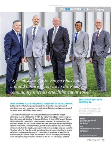 Specialists in Plastic Surgery, PA Left to right: Don L. Oschwald, MD; Matthew W. Blanton, MD; Roger R. Russell, MD; Sanjay V. Daluvoy, MD; Richard E. Carlino, MD RALEIGH: 3633 Harden Road, Suite 200 Raleigh, NC 27607 919.785.0505 CARY: 140 Preston Executive Drive, Suite 201 Cary, NC 27513 919.785.0505 specialistsinplasticsurgery.com