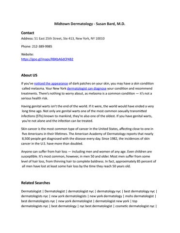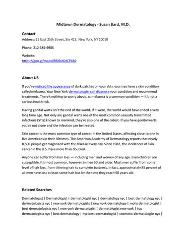 Phone: 212-389-9985 About US: If you’ve noticed the appearance of dark patches on your skin, you may have a skin condition called melasma. Your New York dermatologist can diagnose your condition and recommend treatments. There’s nothing to worry about, as melasma is a common condition — it’s not a serious health risk. Having genital warts isn’t the end of the world. If it were, the world would have ended a very long time ago. Not only are genital warts one of the most common sexually transmitted infections (STIs) known to mankind, they’re also one of the oldest. If you have genital warts, you’re not alone and the infection can be treated. Skin cancer is the most common type of cancer in the United States, affecting close to one in five Americans in their lifetimes. The American Academy of Dermatology reports that nearly 8,500 people get diagnosed with the disease every day. Since 1982, the incidences of skin cancer in the U.S. have more than doubled. Anyone can suffer from hair loss — including men and women of any age. Even children are susceptible. It’s most common, however, in men 50 and older. Most men suffer from some level of hair loss, from thinning hair to complete baldness. In fact, approximately 85 percent of all men have lost at least some hair loss by the time they reach 50 years old.