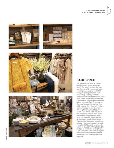 SABI SPREE For Meredith McAuliffe, there’s nothing more important than family. So much so that she said goodbye to a 10-year career as an evening news anchor for KBTX in Bryan-College Station and opened up a trendy women’s fashion store with her mother Janis. With seven years now under their stylish belts, the mother-daughter duo is bringing Sabi Boutique to Century Square this spring. The 900-square-foot shop will feature women’s apparel, jewelry, home décor, giftware, and, of course, Texas A&M attire. Sabi Boutique will also carry unique lines from nationwide bloggers and even from her younger sister Natalie, who creates handcrafted jewelry. “We wanted to provide something for every woman, every style, and every kind of budget, whether she wants to buy something today on a budget or tomorrow as a splurge,” says McAuliffe. “We want everyone who walks in to feel comfortable and a part of our family because they are.”