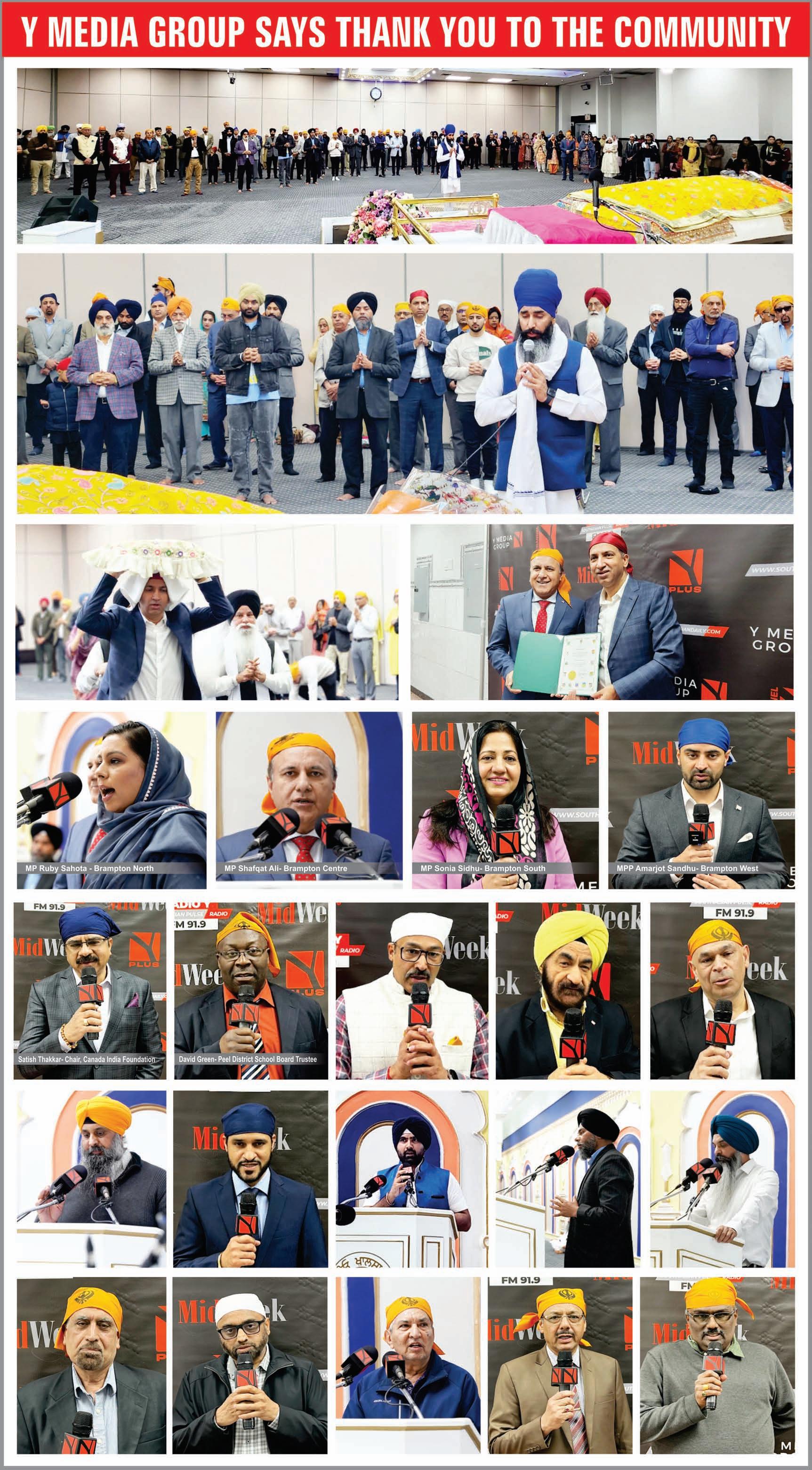 Y Media, on Sunday, April 9, organized its annual 'Sukhmani Sahib Path' at Ontario Khalsa Darbar, Dixie Rd Gurdwara Sahib, to thank the community and spread the message of mutual respect, forgiveness and love. Several VIP dignitaries from the federal, provincial and municipal governments attended the program, Ahmed Hussen, Minister of Housing and Diversity & Inclusion; Sonia Sidhu, MP for Brampton South; Ruby Sahota, MP for Brampton North; Shafqat Ali, MP for Brampton Centre; Amarjot Sandhu, MPP for Brampton West and Parliamentary Assistant to the Minister of Infrastructure; Sheref Sabawy- MPP Mississauga Erin Mills & Parliamentary assistant to the minister of public and business service delivery member; Gurpartap Singh Toor, Brampton Regional Councillor- Wards 9 & 10 and Chair of Brampton Economic Development; Satish Thakkar, Chair, Canada India Foundation; Mirza Naseem Baig, (Ahmadiyya Muslim Community) and Ashfaq Ahmed; Peel regional police deputy chief Mark Dapat; Peel Regional Police superintendent (21 Division Command) Raj Biring; Peel Regional Police Constable Manjit S. Basran and Amarjit Sohi; David Green, Trustee of Peel School Board; Sandeep Sangha among many others.