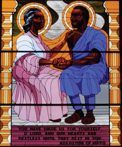 Por el contrario, otras representaciones enfatizan la herencia africana de Agustín, incluida una vidriera en una iglesia en Washington D.C. de Agustín y su madre, Santa Mónica. El arte religioso es a menudo un medio poderoso para moldear las percepciones de los santos, y las representaciones de Agustín como "africano" permiten a los cristianos africanos ver a uno de los más grandes teólogos del cristianismo como parte de su propia herencia.