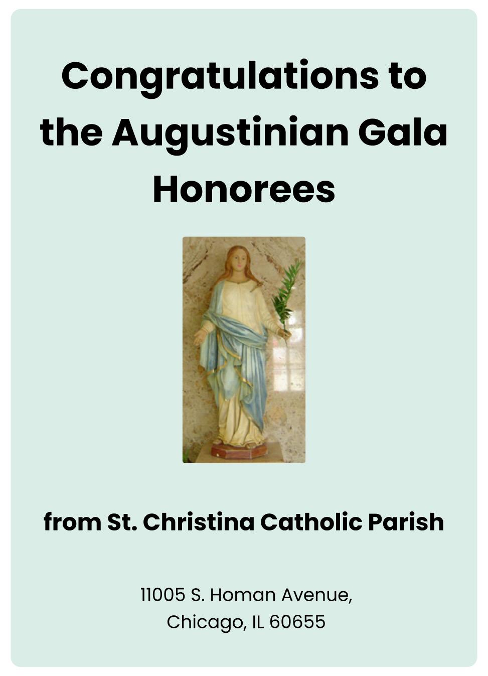 It is with immense joy and anticipation that I extend to you a warm welcome to the 2024 Augustinian Gala at the historic Drake Hotel. This evening promises to be a celebration of our shared Catholic Augustinian values, accomplishments, and the profound impact of our wider Augustinian family.