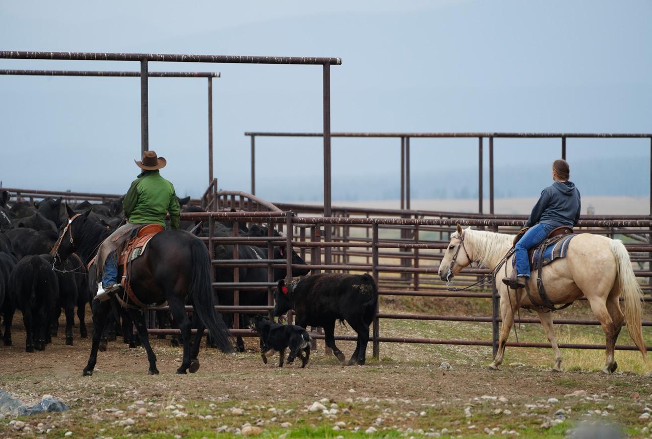the evening. I ran the dogs under the starry night, powered up the Starlink to catch up with emails, and then slept with my 2 warm snoring compan ions in the back seat. 6 am came quick though and without any coffee, I made it on time. 330 calves were to be weaned that day and the process looked much more pro than practice. Here's where I meet Tammi, Jim's wife, and other trusted people in their circle that make this smooth as butta. Tyler does the branding, Tammy the entries, Joe the numbers, everybody had a job to do. Mine was to stay out of the way but I also have a camera that likes to be nosy. Tammi occasionally jumped on her horse to herd some newbies in (Tammi's on the front cover