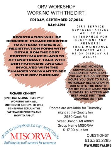 28: Dirt Groomer Workshop. 8:00am - 4:00pm. MISORVA, in partnership with DNR, will again hold a Dirt Workshop on Friday, September 27, 2024. Please save this date and plan to attend! We plan to have another education and awareness event on the changes and advancements of the dirt community. Frank Alley Memorial Park