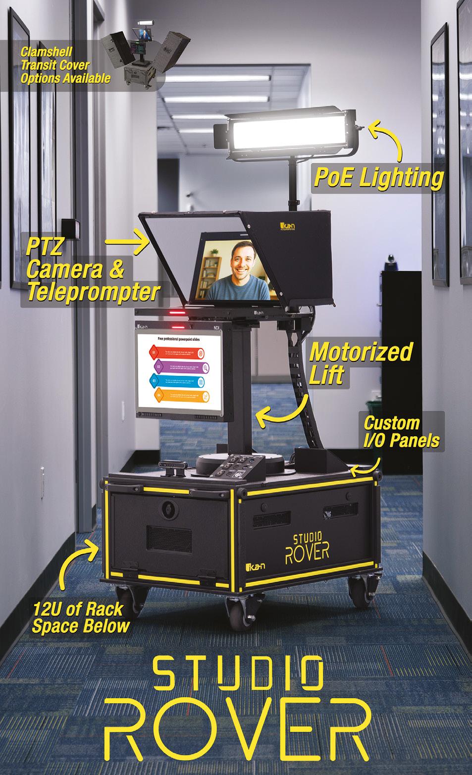 The Ikan Studio Rover is a fully integrated mobile production platform designed to simplify the deployment of professional broadcast and AV environments. Engineered for flexibility, mobility and rapid setup, the Studio Rover combines camera support, lighting, prompting and integrated equipment infrastructure into a single compact system. It is specifically designed for corporate, government, education, broadcast and content creation environments that require professional production capability without the complexity and cost of permanent studio installations.