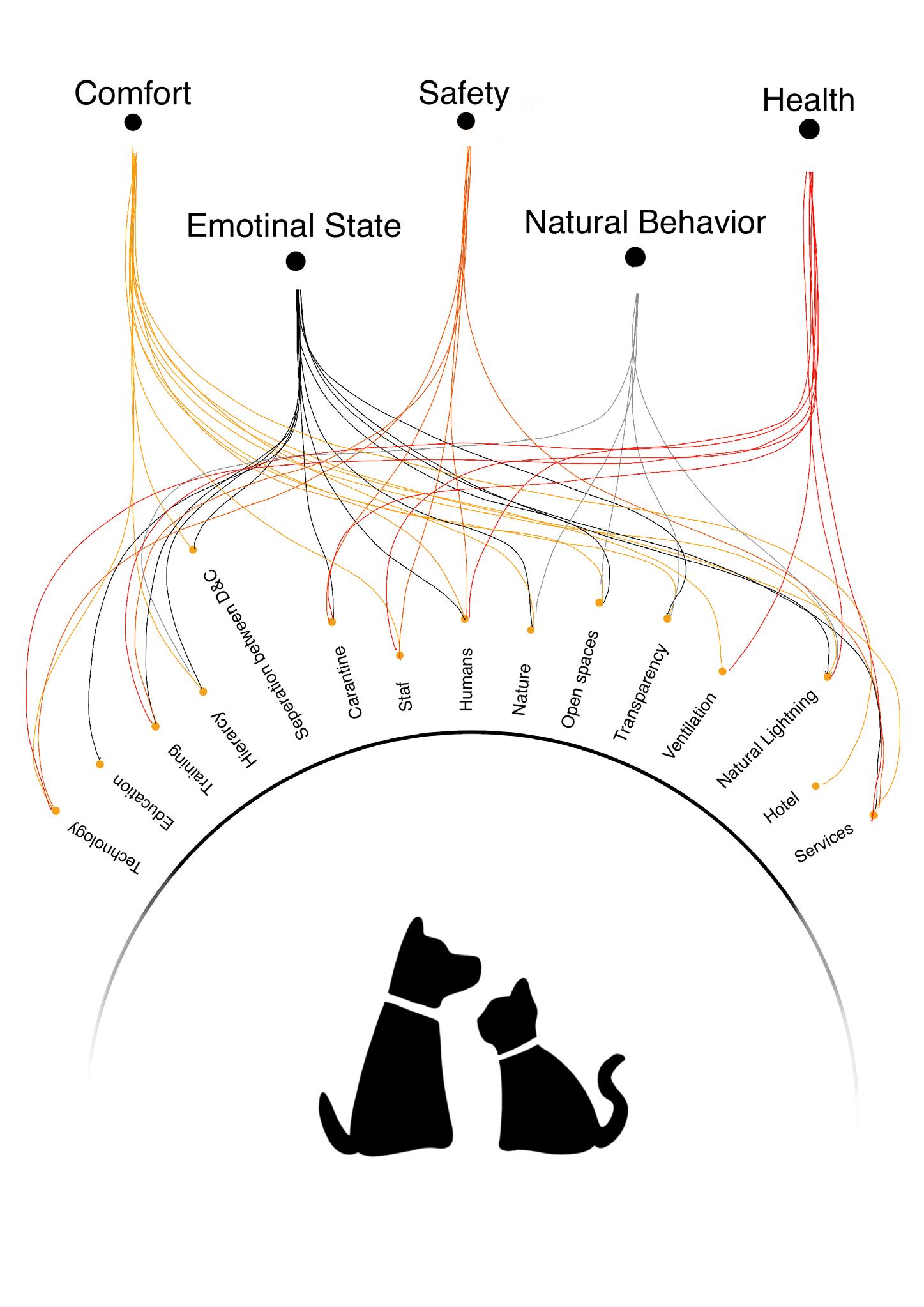 Yard C is the third and final courtyard of the clinic which is in the service of the hotel. This environment will be used from the dogs who will be staying at the clinic hotel. Yard C is easily accessible as for dogs even for the staff who will be at their service at all times. This space offers many different elements which positively affect dogs, especially their emotional state as these dogs face a different reality unlike what they are used to seeing and living every day and face the fear of abandonment.