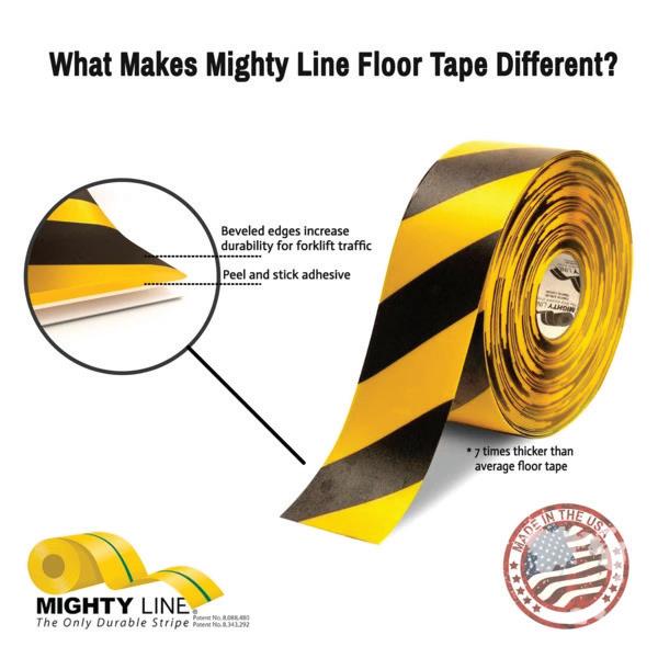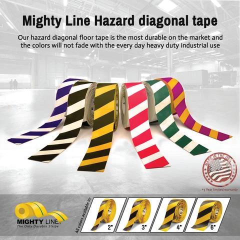 The Patented Mighty Line diagonal floor tape is most durable diagonal tape on the market. The diagonal floor tape is great for marking off caution, hazards, and other extra dangerous areas in the facility or warehouse. Mighty Line diagonal floor marking tape is great to warn pedestrians that is safety precaution zone.
