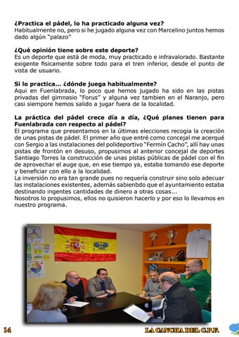 ¿Practica el pádel, lo ha practicado alguna vez? Habitualmente no, pero si he jugado alguna vez con Marcelino juntos hemos dado algún “palazo” ¿Qué opinión tiene sobre este deporte? Es un deporte que está de moda, muy practicado e infravalorado. Bastante exigente fisicamente sobre todo para el tren inferior, desde el punto de vista de usuario. Si lo practica... ¿dónde juega habitualmente? Aqui en Fuenlabrada, lo poco que hemos jugado ha sido en las pistas privadas del gimnasio “Forus” y alguna vez tambien en el Naranjo, pero casi siempore hemos salido a jugar fuera de la localidad. La práctica del pádel crece día a día, ¿Qué planes tienen para Fuenlabrada con respecto al pádel? El programa que presentamos en la últimas elecciones recogia la creación de unas pistas de pádel. El primer año que entré como concejal me acerqué con Sergio a las instalaciones del polideportivo “Fermín Cacho”, allí hay unas pistas de frontón en desuso, propusimos al anterior concejal de deportes Santiago Torres la construcción de unas pistas públicas de pádel con el fin de aprovechar el auge que, en ese tiempo ya, estaba tomando ese deporte y beneficiar con ello a la localidad. La inversión no era tan grande pues no requería construir sino solo adecuar las instalaciones existentes, además sabienbdo que el ayuntamiento estaba destinando ingentes cantidades de dinero a otras cosas... Nosotros lo propusimos, ellos no quisieron hacerlo y por eso lo llevamos en nuestro programa.