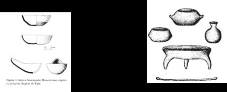 Formas y bordes: en el caso de otras formas de vasija, estos atributos no difieren sustancialmente de los de fines del Posclásico tardío del complejo azteca III tardío. no obstante, hay cambios en la frecuencia de la forma de los bordes de cajetes y cazuelas, predominando el recto con terminación plana. Ámbito urbano. En el ámbito urbano de Tenochtitlan y Tlatelolco se encuentra cerámica lisa, descrita por noguera (1934: 274-275), que en la tipología desarrollada para Tlatelolco forma parte de la Loza transicional Bruñida.