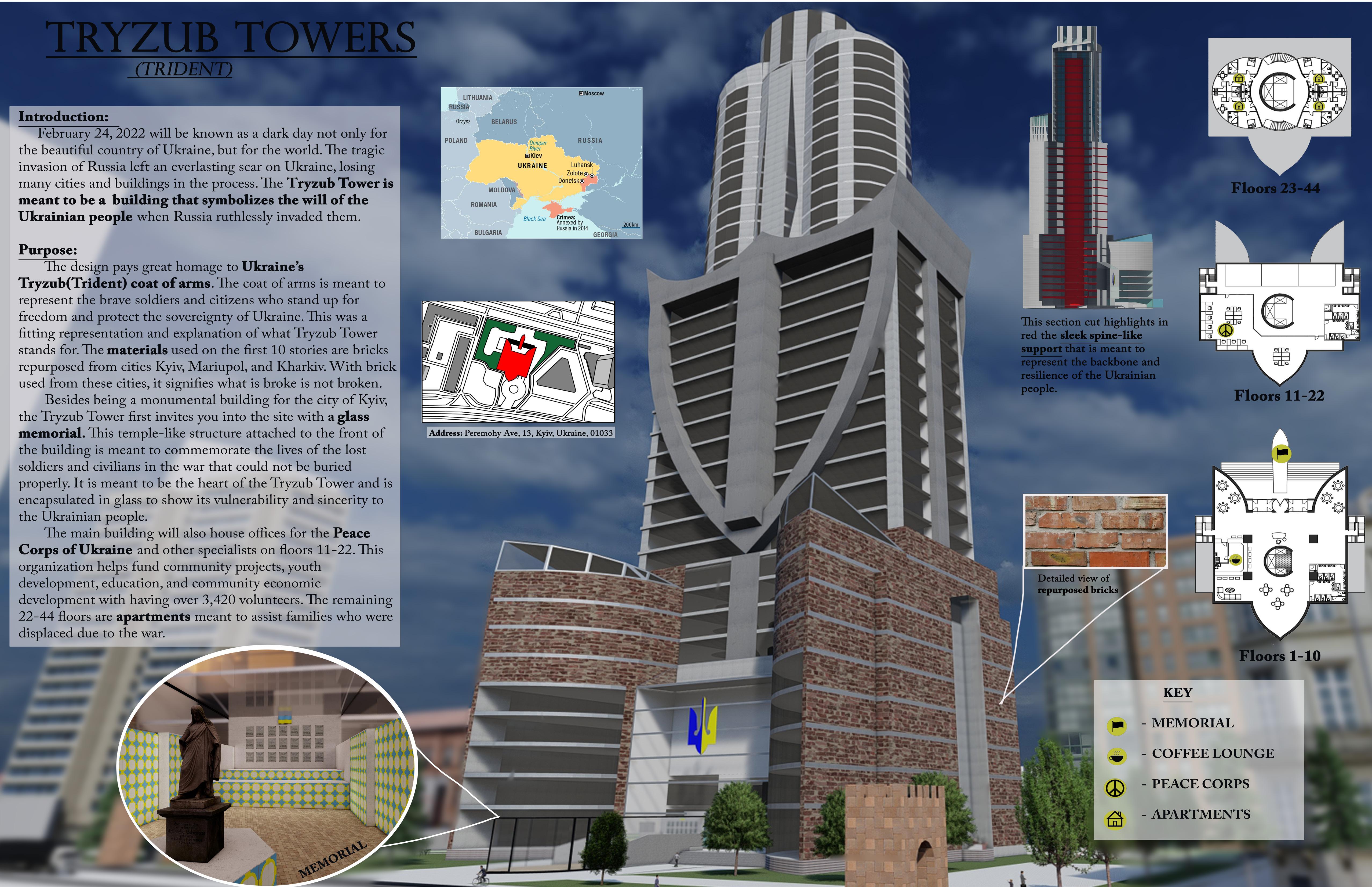 Poster for a design competition on Builder Architecture Competitions (BAC). The design was based in Kyiv, Ukriane and was intended to become a monumental building was the invasion of Russia.