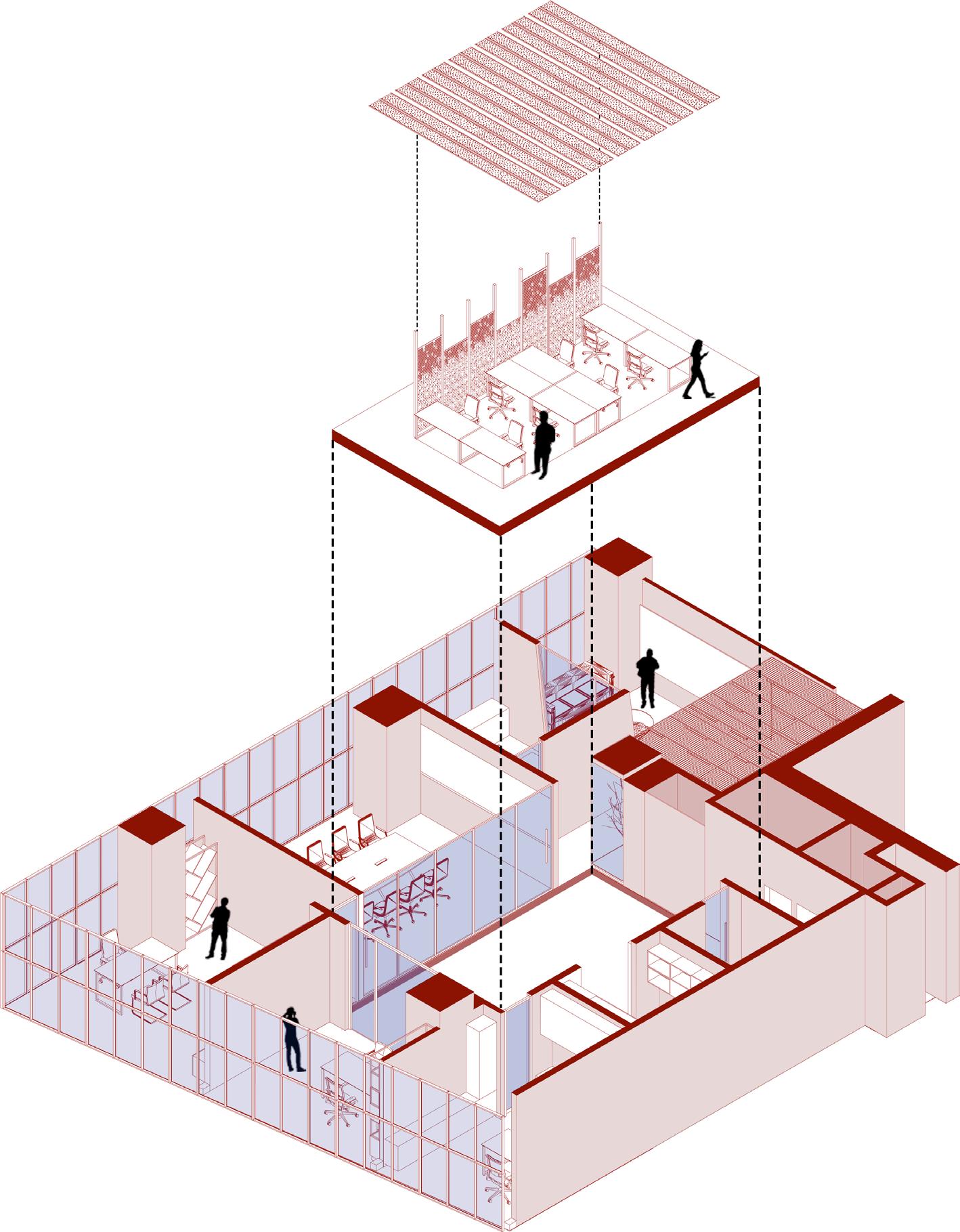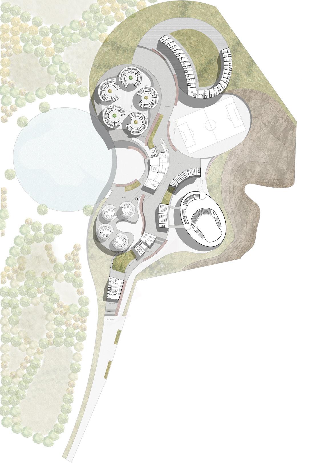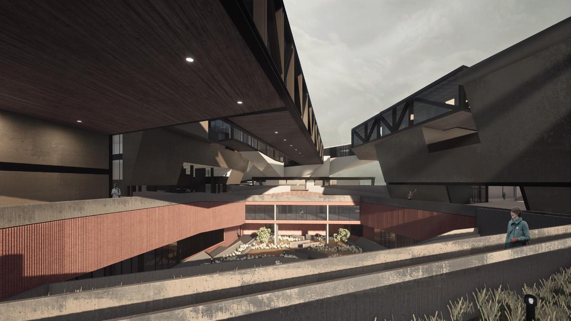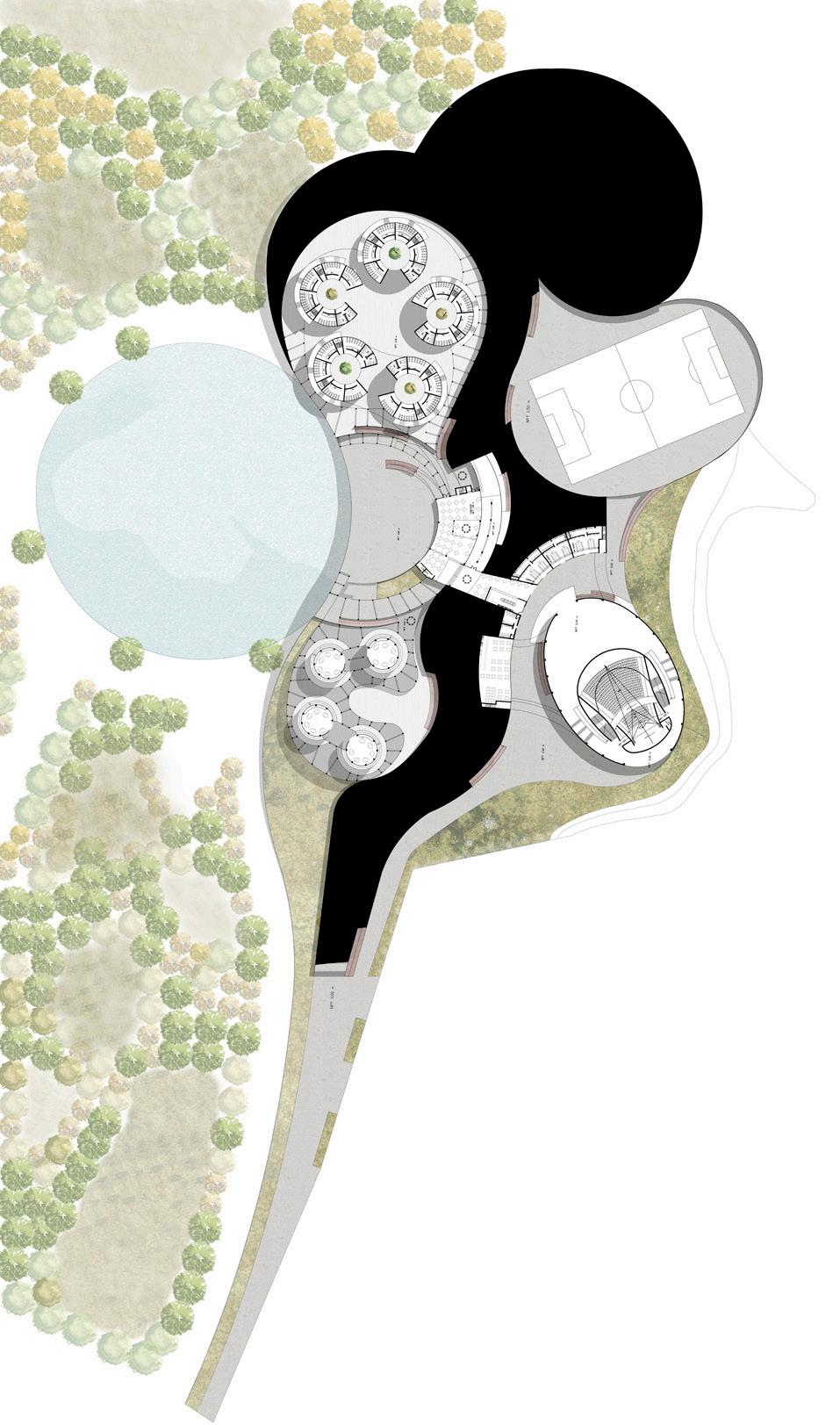 The project was conceived as a response to the lack of interest from the state and is divided into two sector which are named based on their relationship with the enviroment through their shape and materiality, as well as a space called “ barrier” that physically separates them by an unevenness.