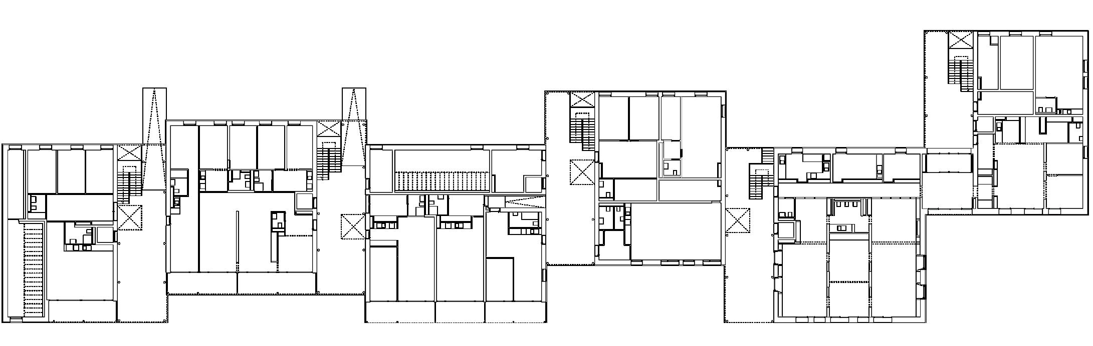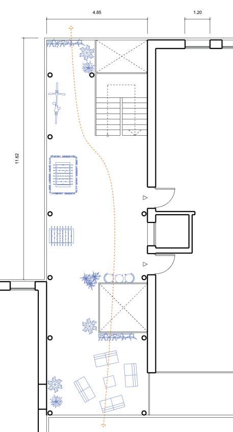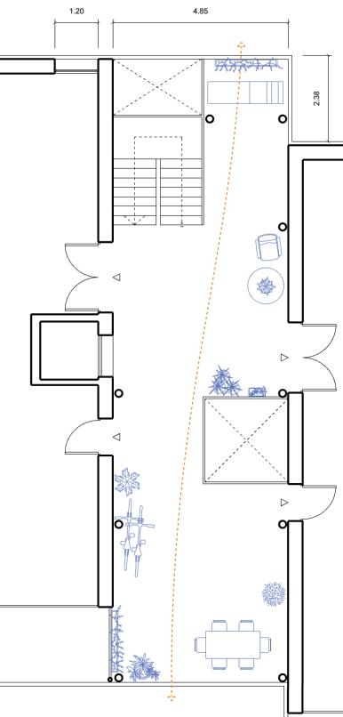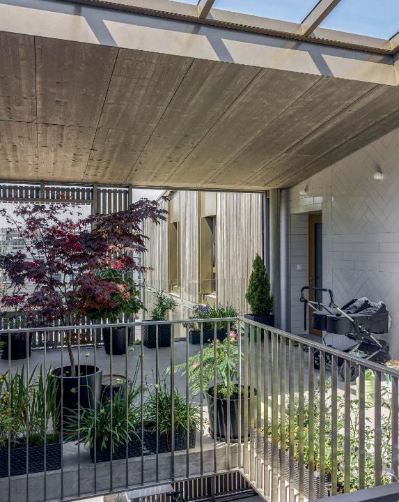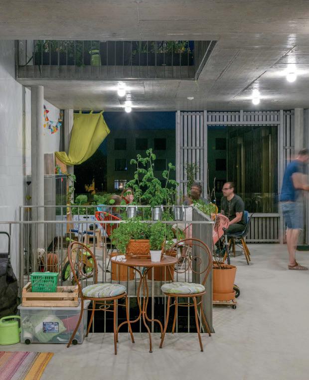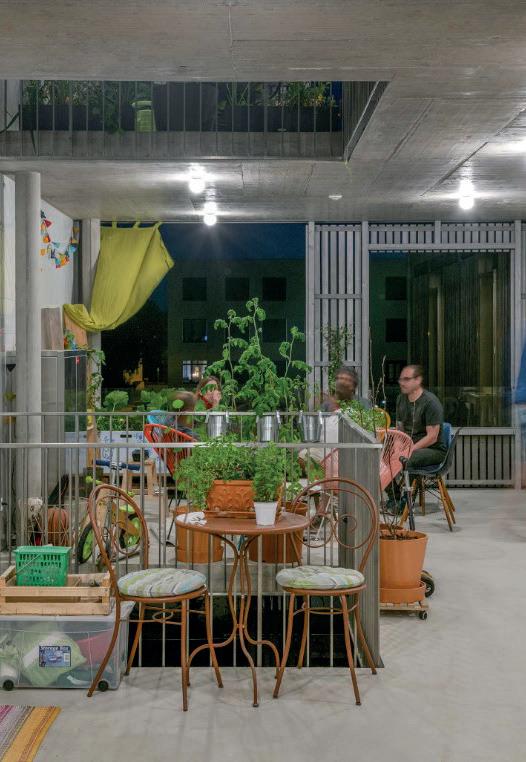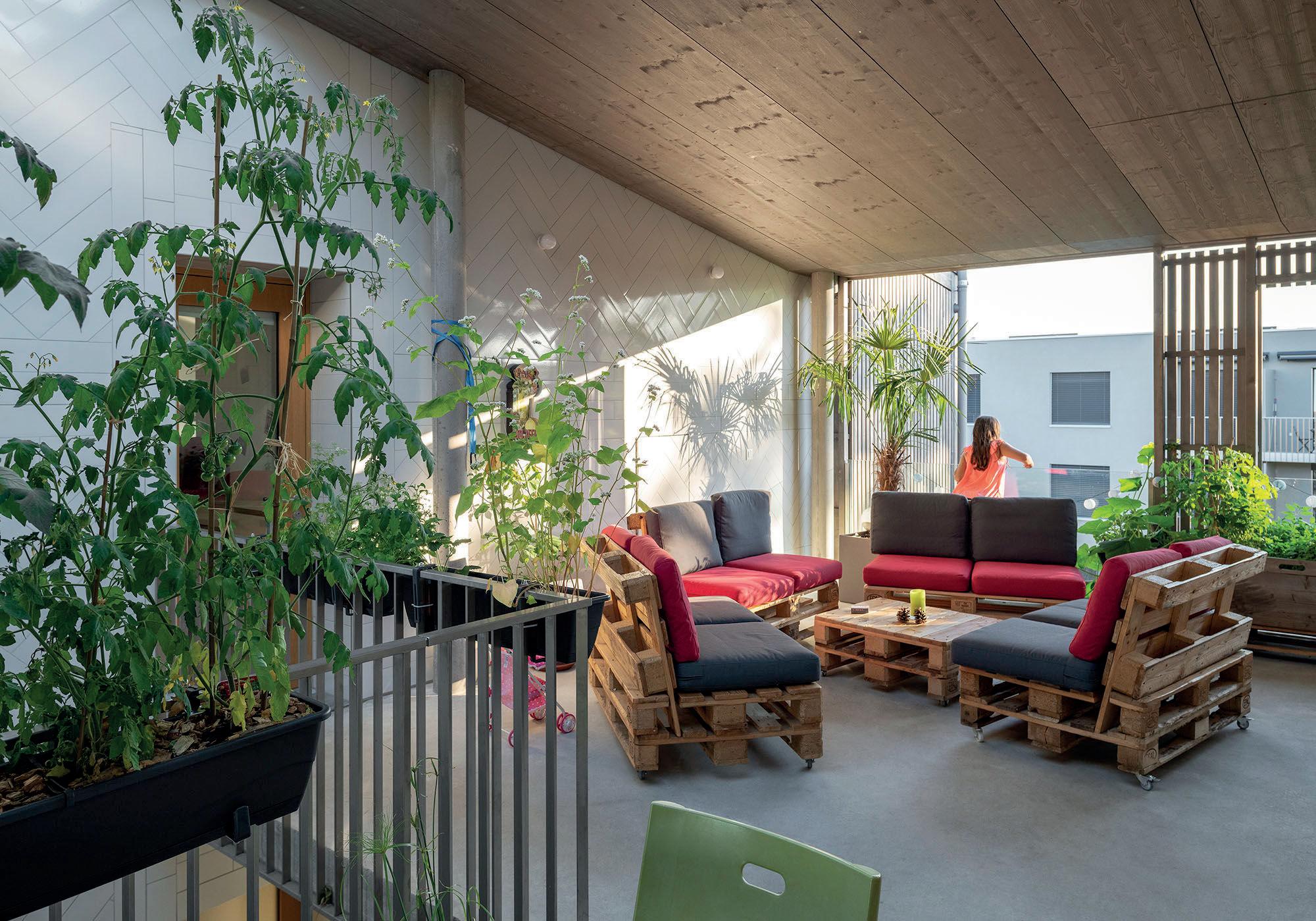 Estas se suelen destinar a albergar las escaleras y el ascensor y a ser meramente una zona de paso. Sin embargo, en este caso detectamos unos elementos clave muy interesantes que permiten generar situaciones que fomentan la relación y conviviencia entre vecinos formando una comunidad.