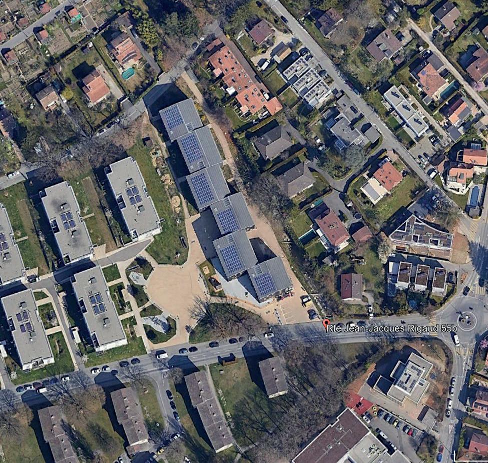 El conjunto se ubica en una zona residencial en la periferia de Ginebra. Las viviendas se distribuyen en 6 bloques yuxtapuestos, que se deslizan entre sí creando un escalonamiento.