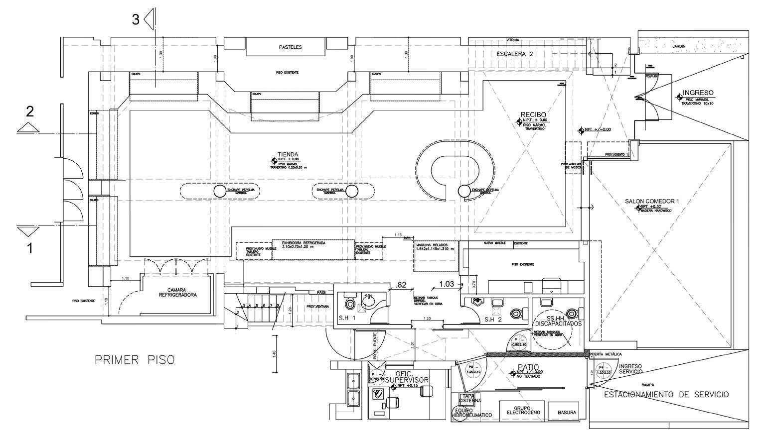 En coordinación con el Arquitecto Jorge Balerdi, me asignaron el dibujo de la planta de remodelación de la pastelería y panadería San Antonio ubicada en Chacarilla distrito de Surco como también realizar la propuesta de los espacios internos. Finalmente, se presentó lo requerido previa revisión y próximo a su construcción.